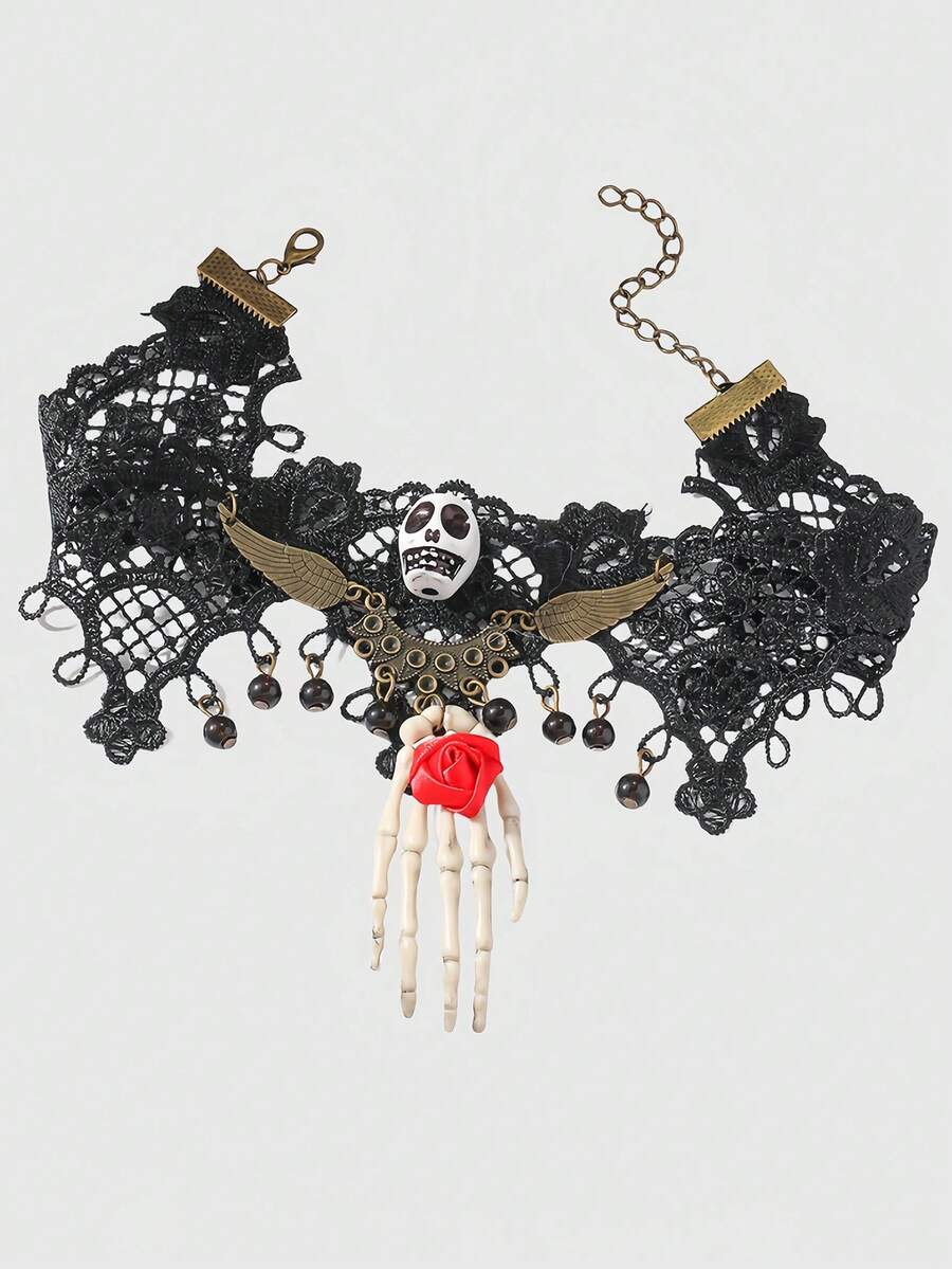 Vintage Gothic Style Skull Rose Palm Lace Necklace, Choker