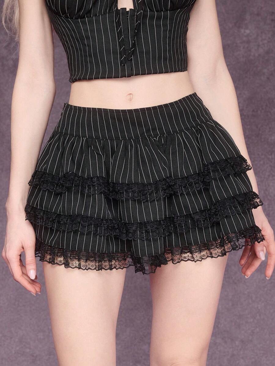Goth Vintage Streetwear Cute Academic Striped Black White Gray Bow Satin Ribbons Multi-Layer Cake Lace Trim Women Skirt