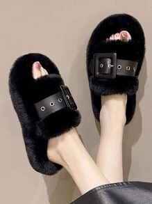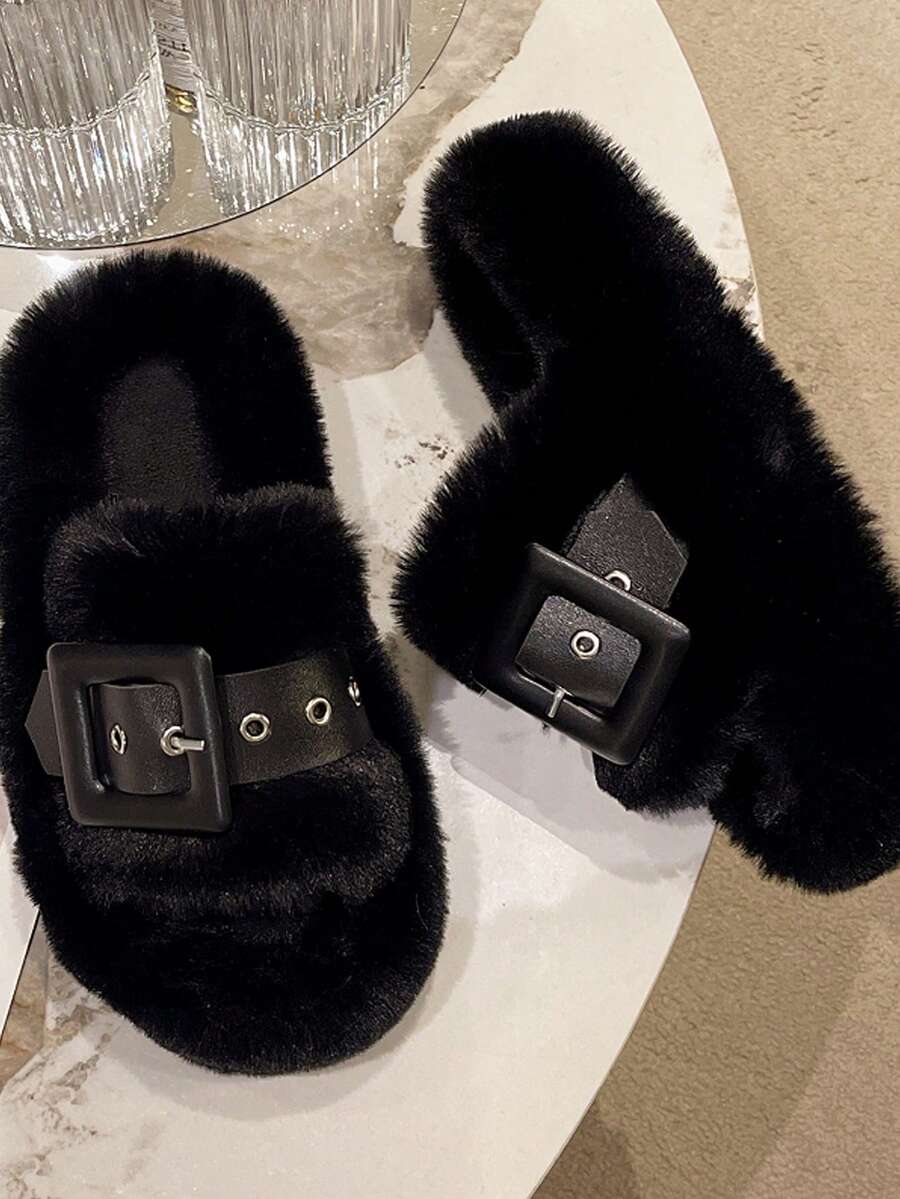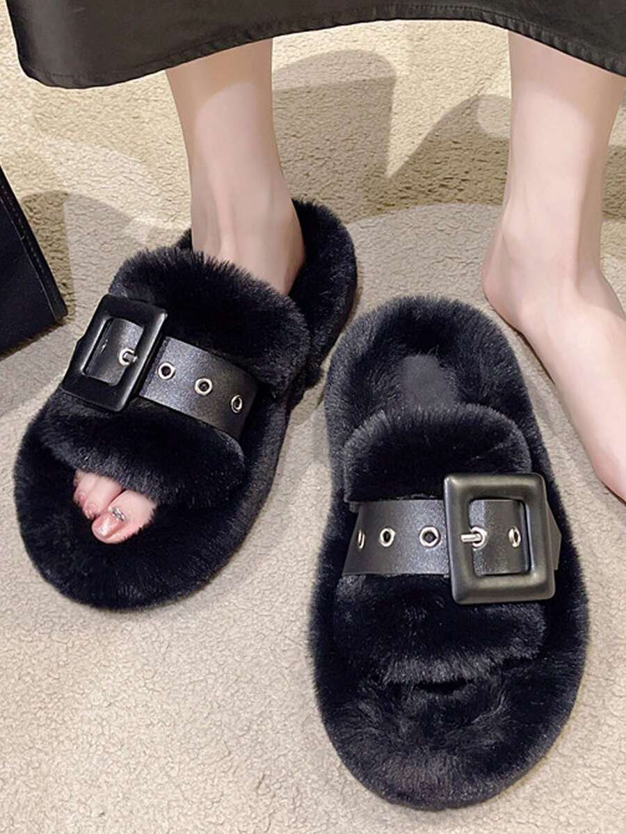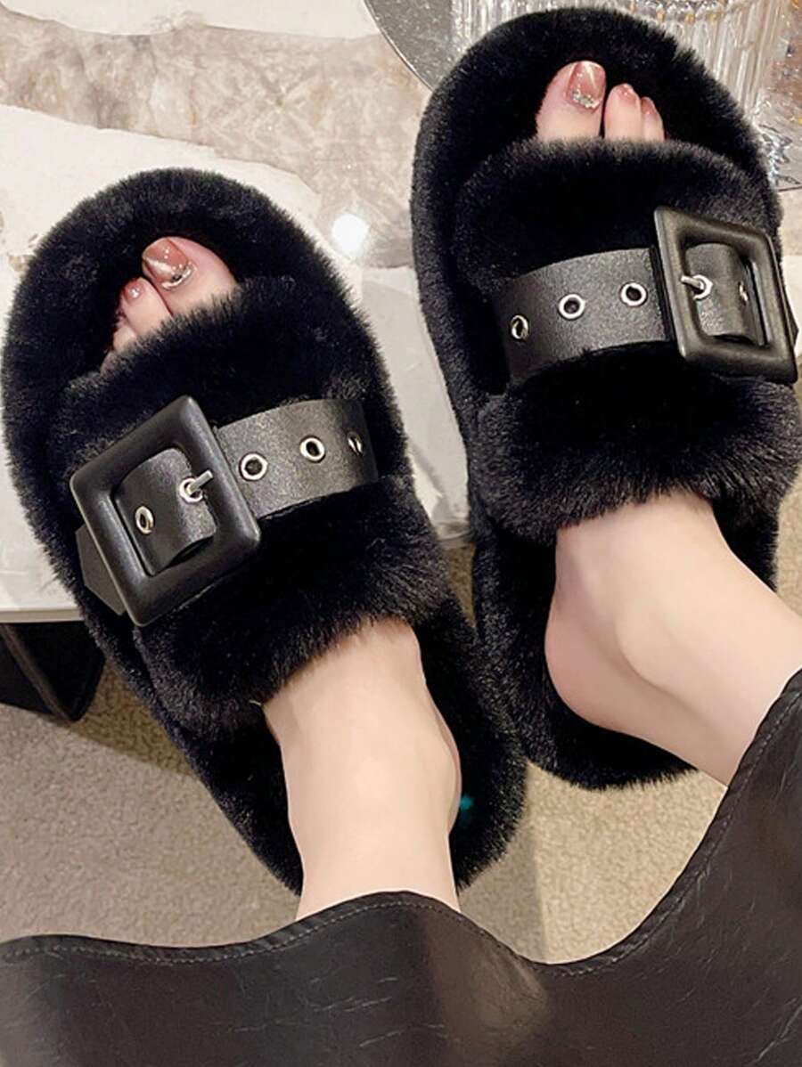 Goth Women Buckle Decor Fuzzy Bedroom Slippers, Fashion Home Slippers