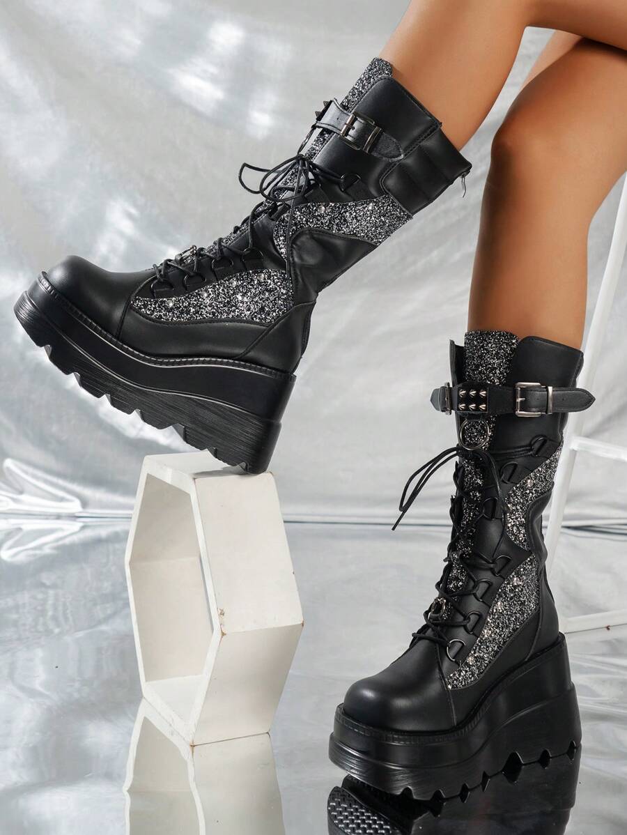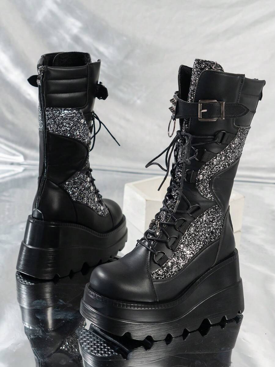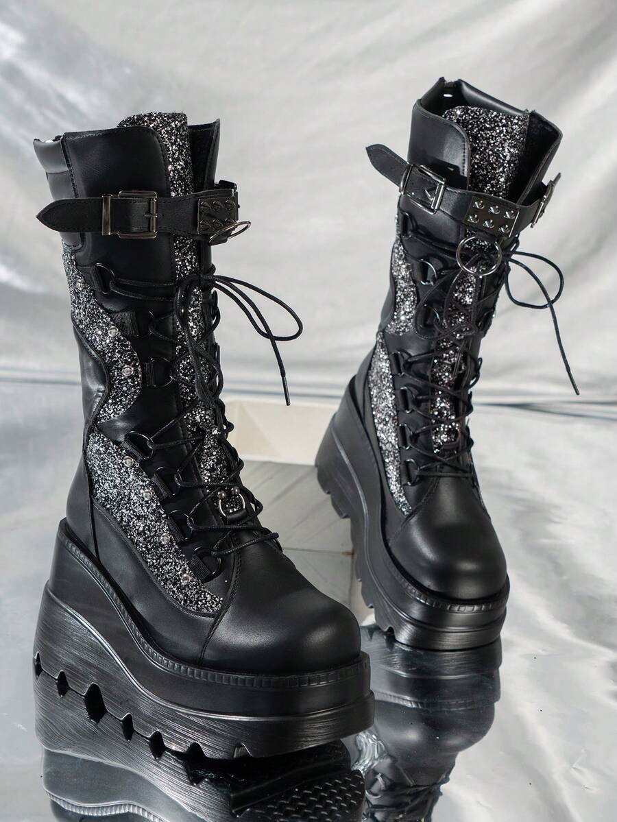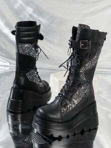 Goth Women Lace Up Glitter Mid-Calf Boots, Punk Outdoor Fashion Boots