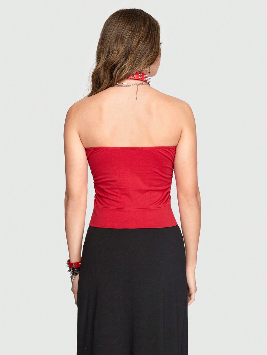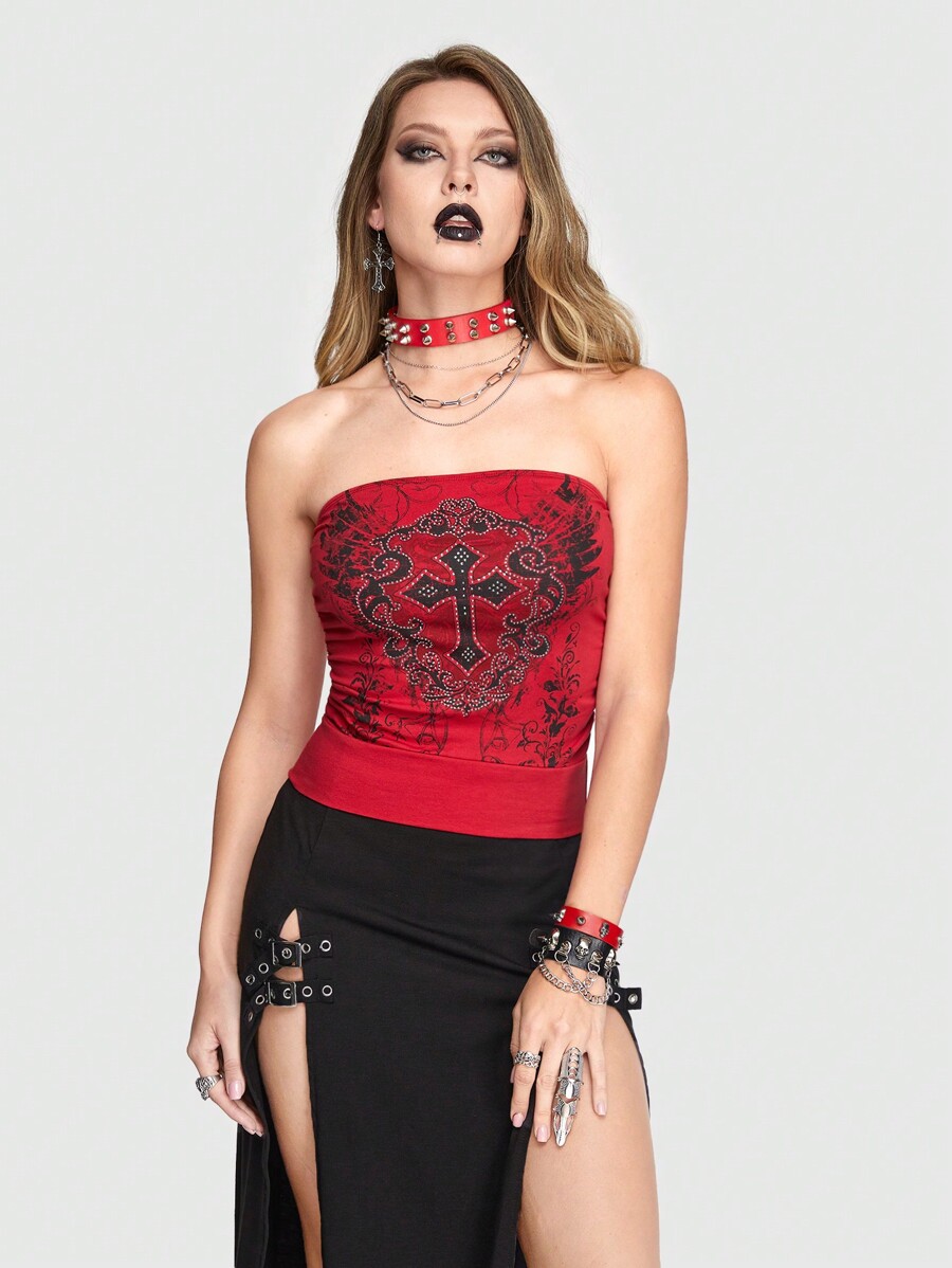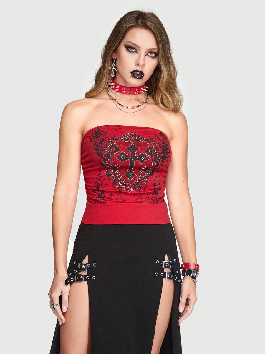 Goth Women' Rhinestone Cross & Wing Print Strapless Top