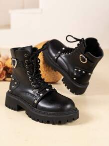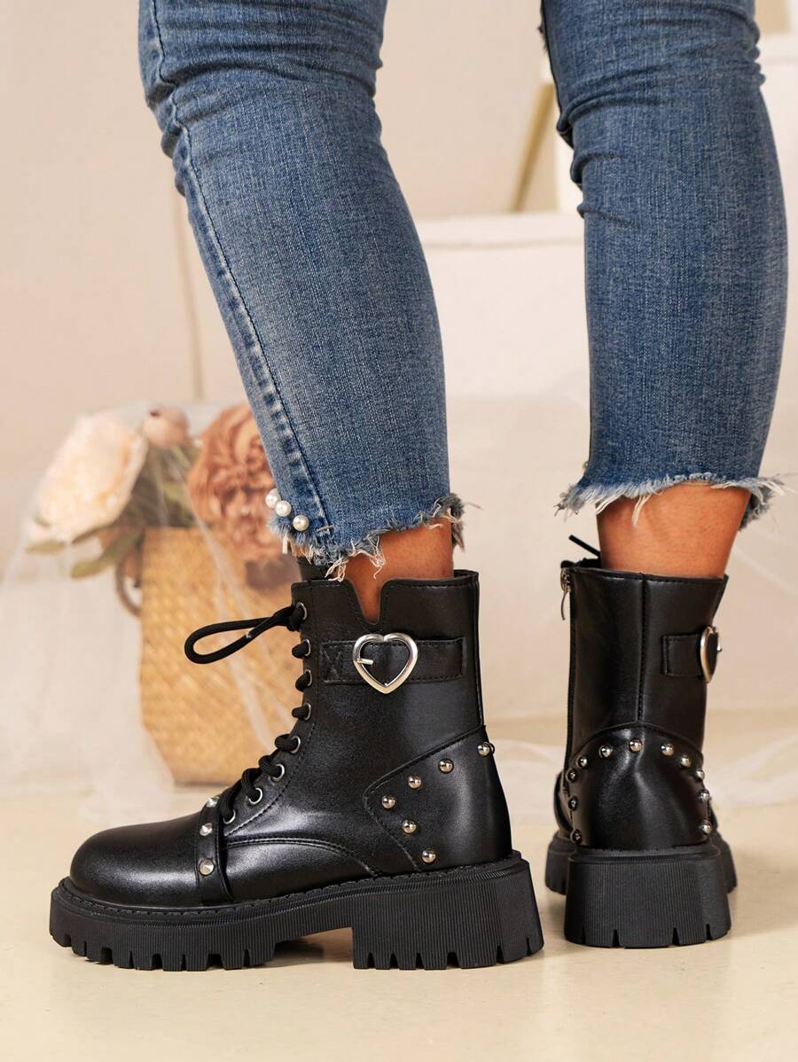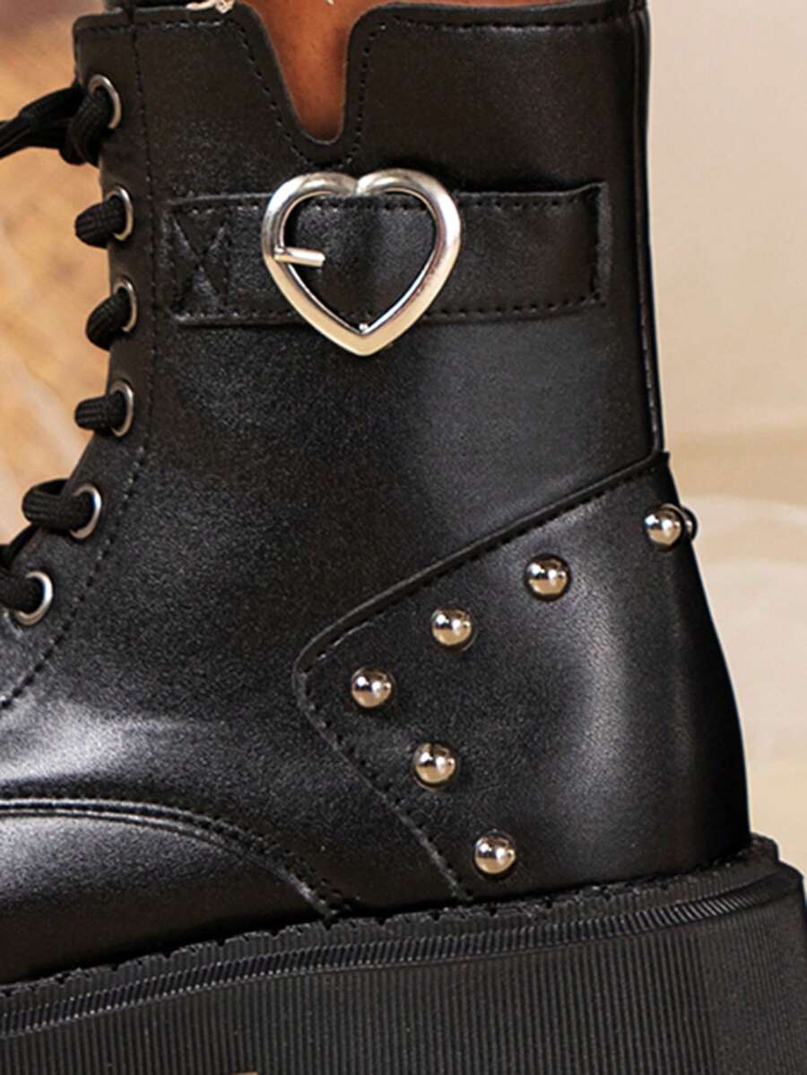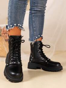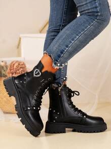 Goth Women Solid Studded Decor Lace-up Front Combat Boots, Punk Outdoor Fashion Boots