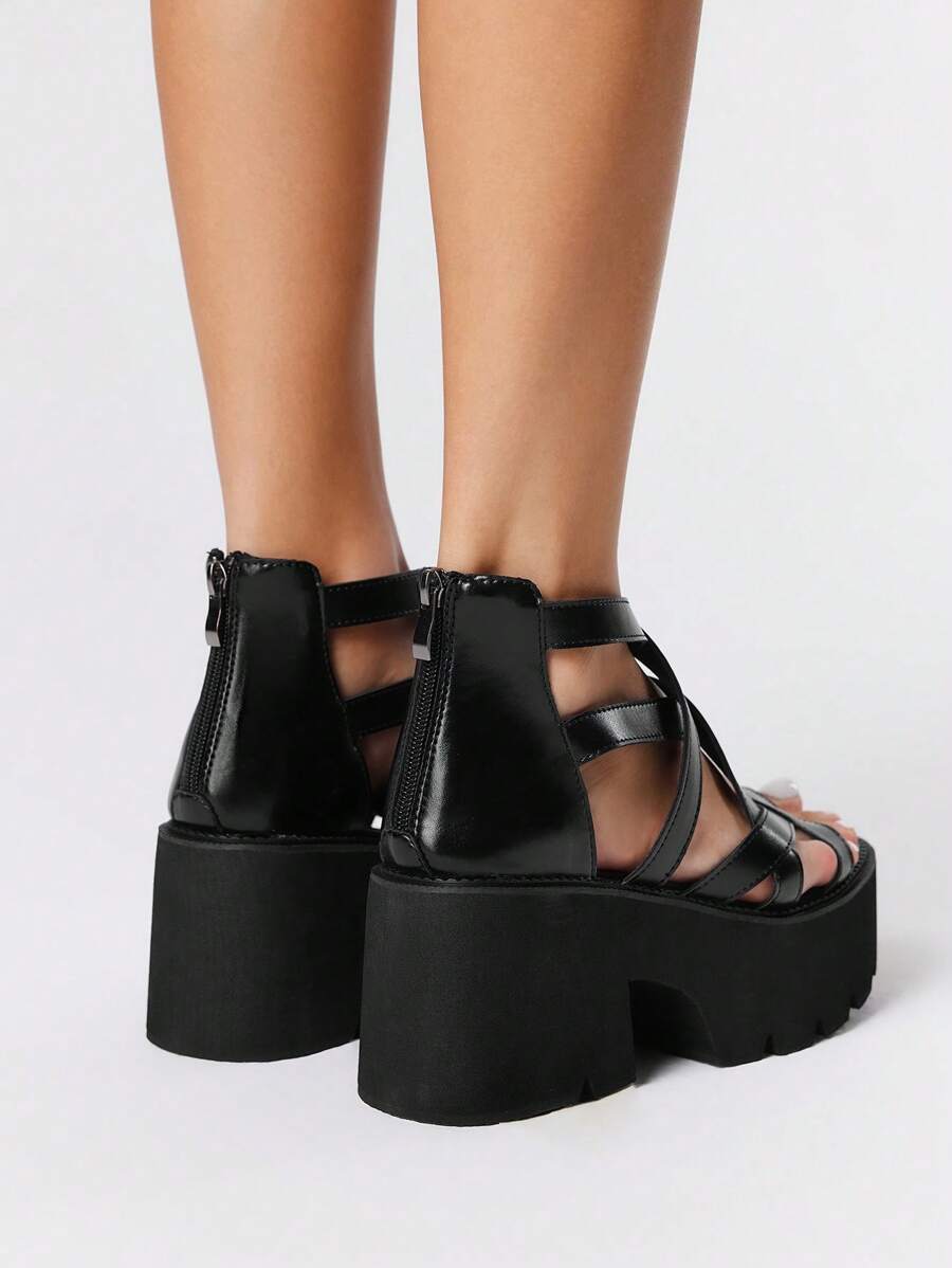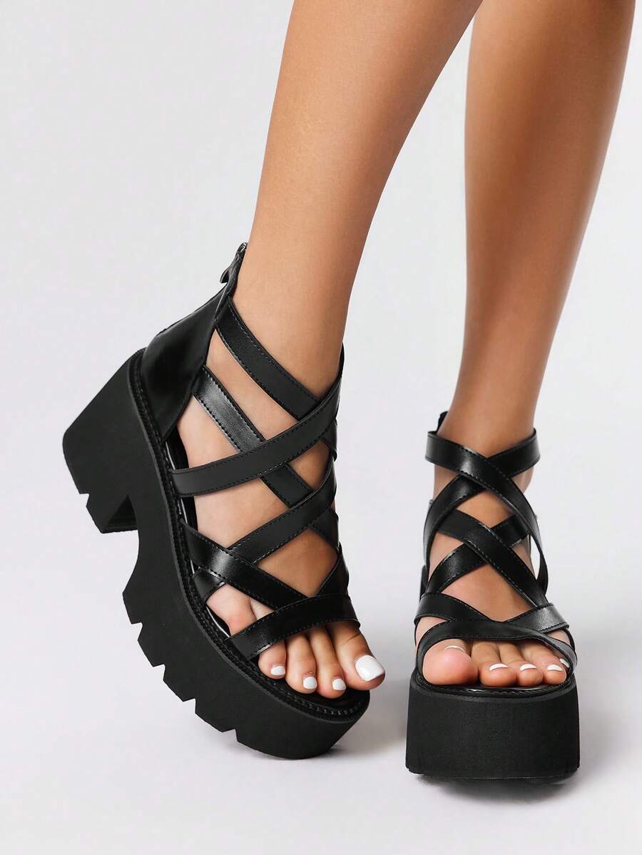 Women's Black Casual Retro Roman Style Platform Sandals Women's Punk Gothic Crossed Strap Rear Zipper Platform High Heel Sandals