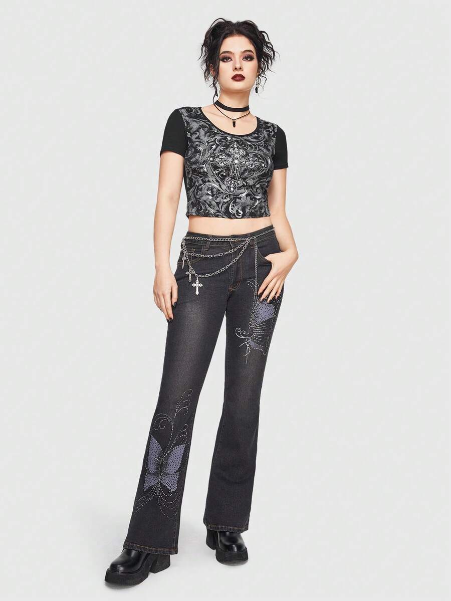 Goth Women's Black Cross & Baroque Print Crew Neck T-Shirt