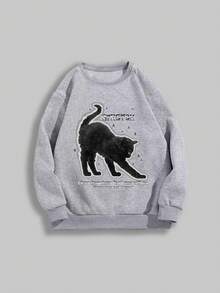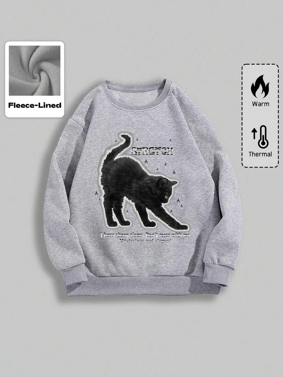 Goth Women's Dark Cat Graphic Fleece Crew Neck Long Sleeve Sweatshirt, Autumn/Winter