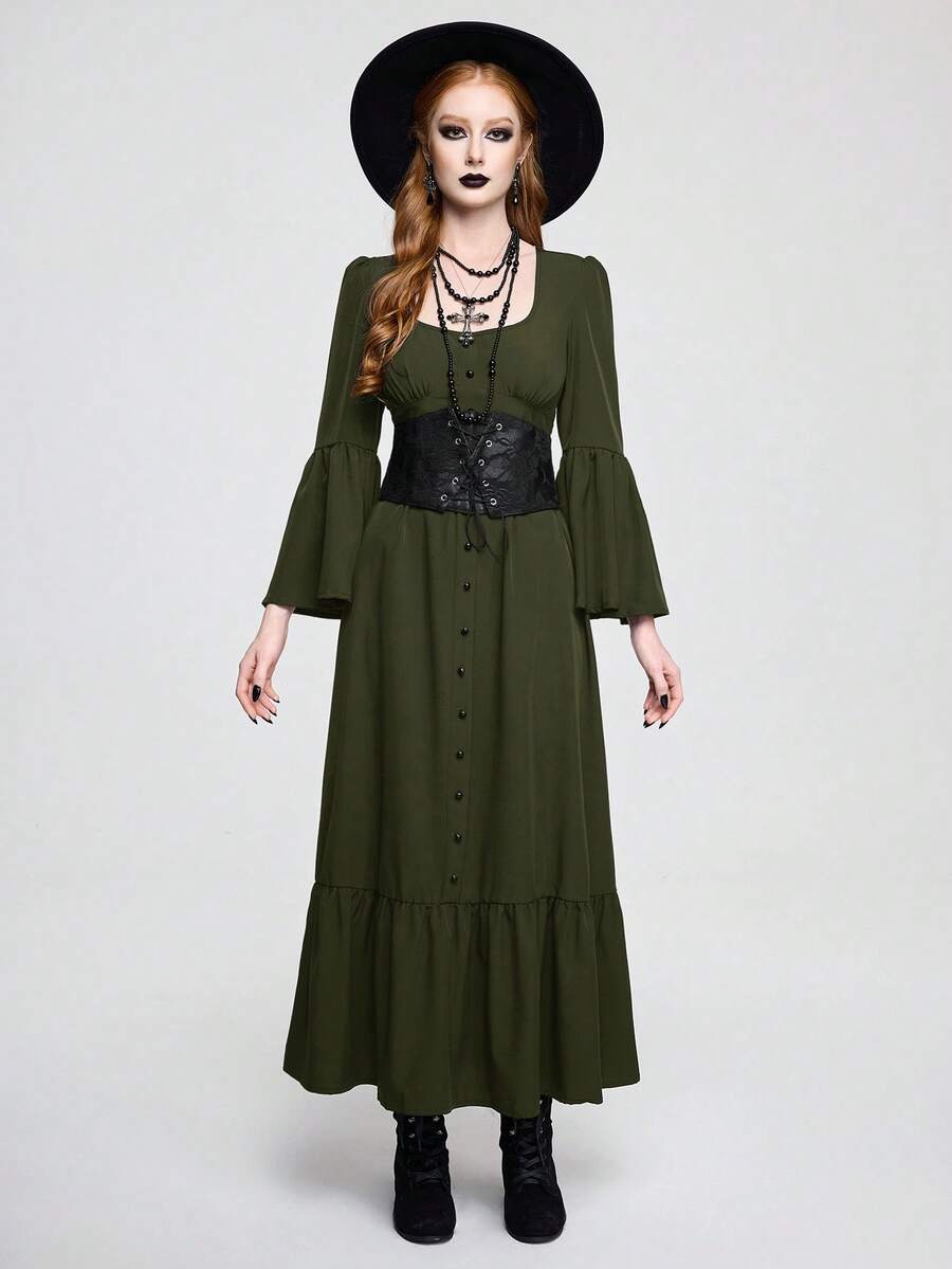 Goth Women's Elegant Solid Color U-Neck Flare Sleeve Dress