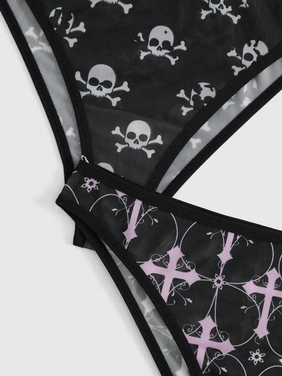 Goth Women's Gothic Cross Chain Skull Mesh Floral Printed 5 Pieces Set