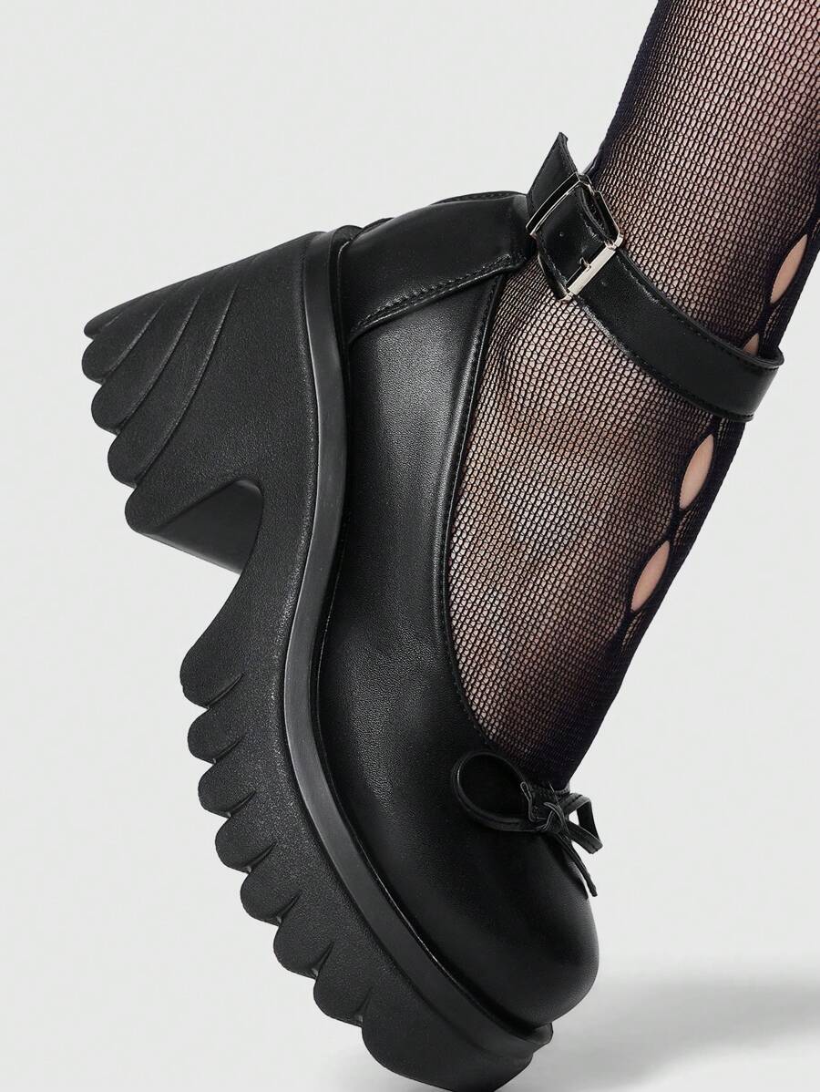 Women's Mary Jane Shoes, Black Leather Collegiate Style, Strap , Wedge Heel, Platform, Gothic, Bow Decor, Chunky Heel, Loafers, Work/Formal