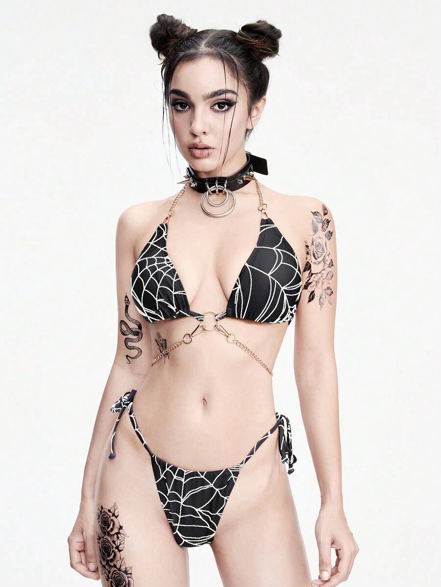 Goth Women's Spider-Web Printed Halter Neck Sexy Bikini Set Summer
