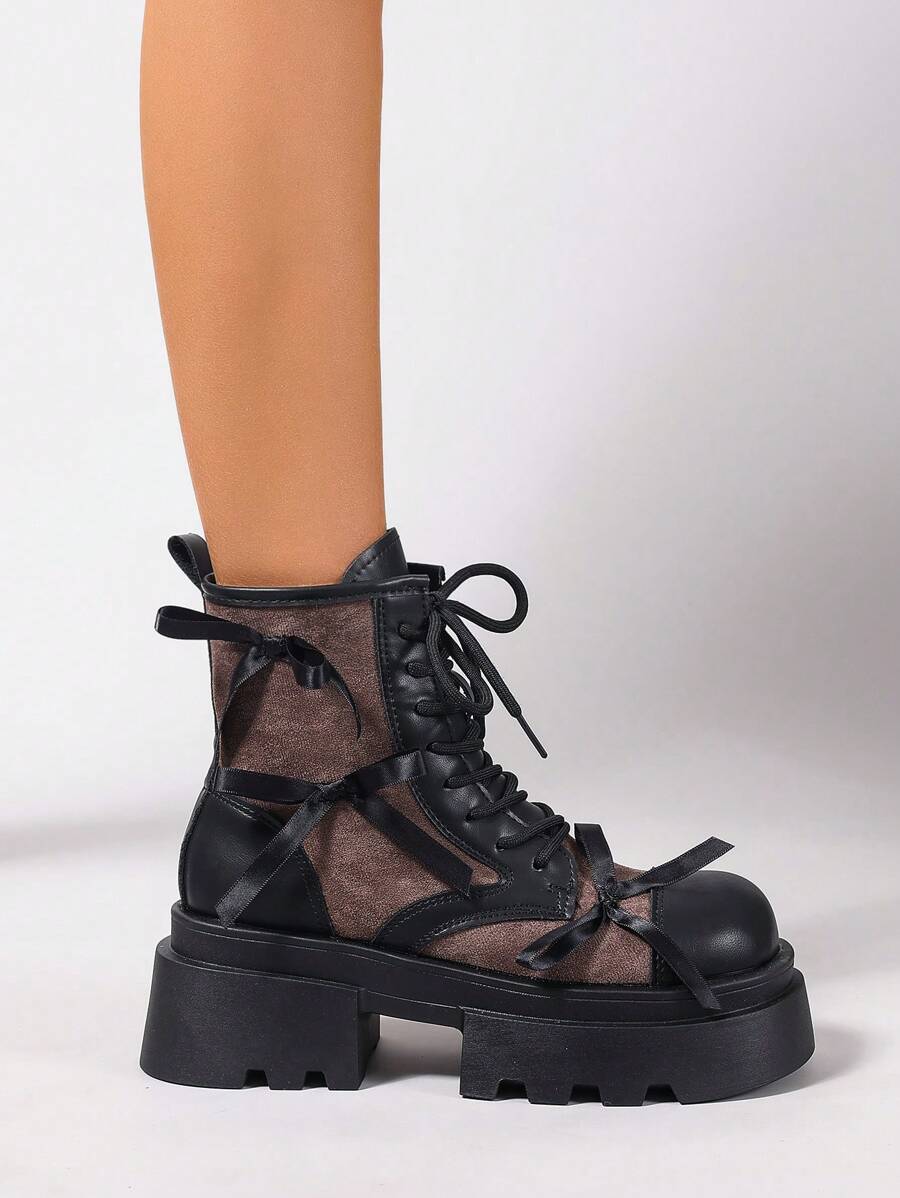 Goth Women's Sweet & Cool Platform Boots, New Arrival Spring/Autumn, British Style Black Round Toe Canvas Bow Lace-Up Short Ankle Boots Valentine's Day