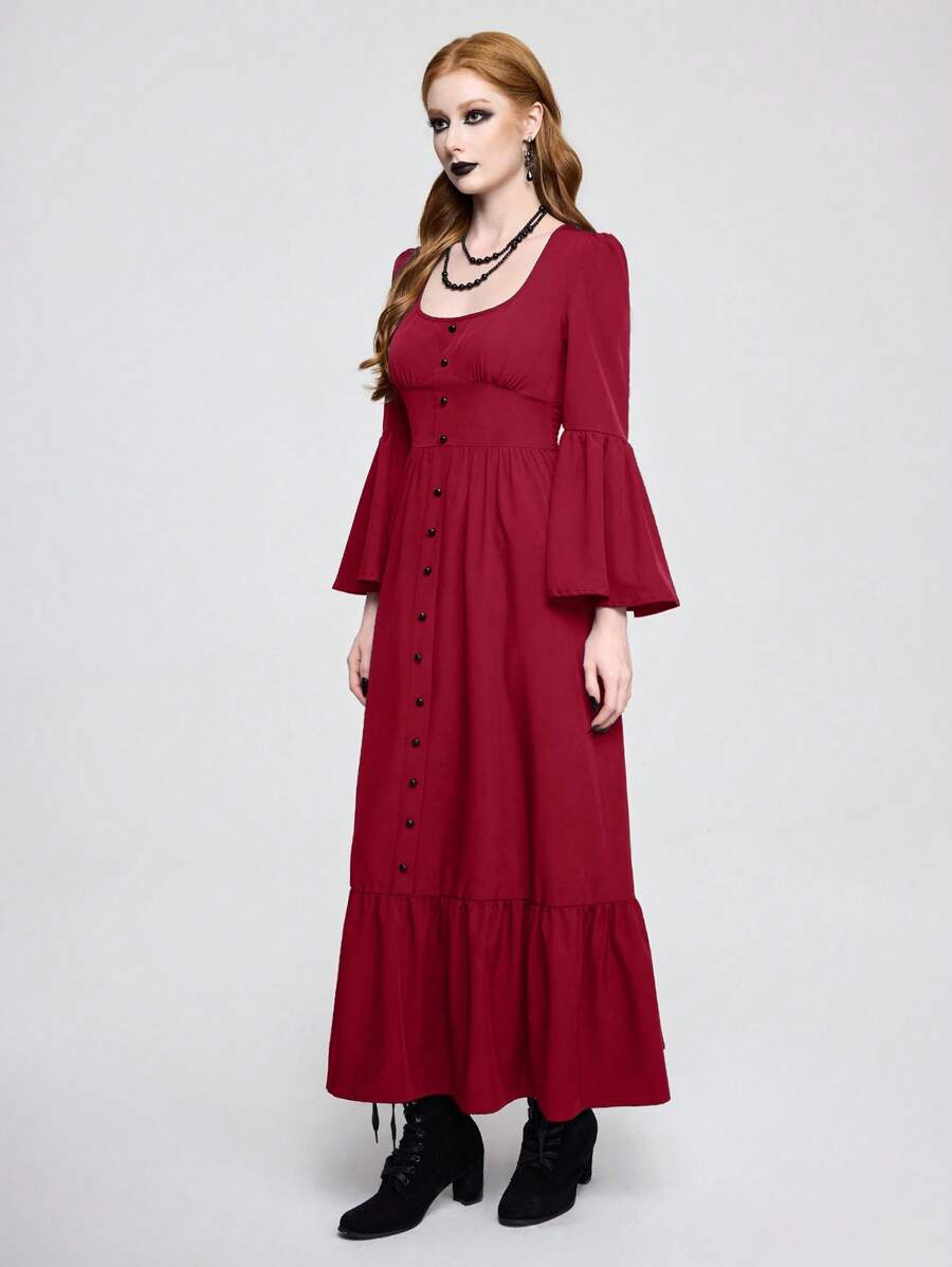 Goth Women's U-Neck Solid Color Flare Sleeve Long Elegant Dress