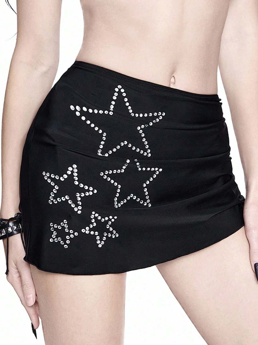 Goth Women's Vacation Rhinestone Star Side Drawstring Mini Cover-Up Skirt, Halloween