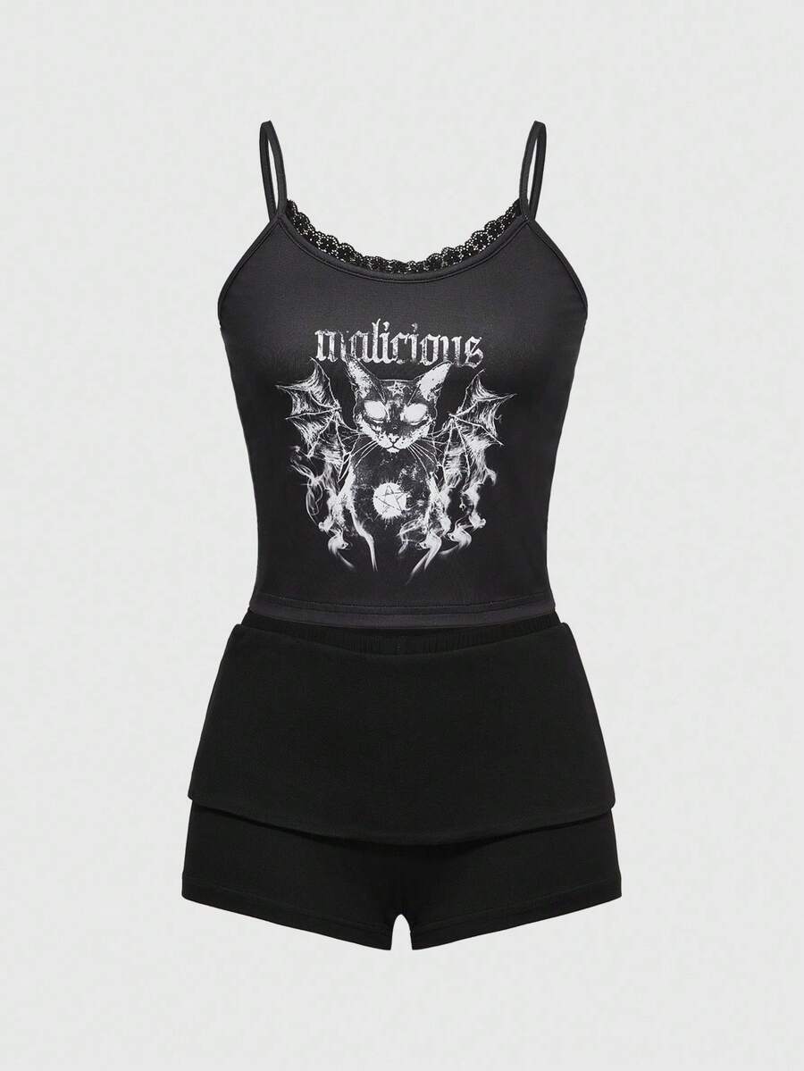 Gothic Cat Print Camisole Short Sleeve & Shorts Pajama Set