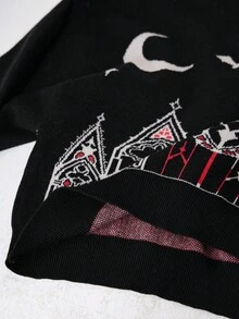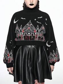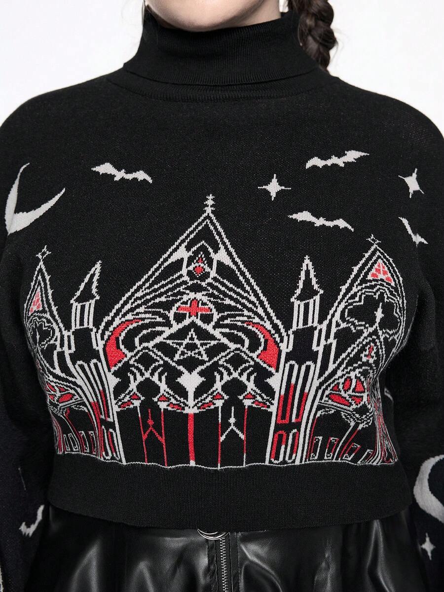 Goth Gothic Christmas Outfit Castle & Cross Pattern Plus Size Women Turtleneck Contrast Color Pullover Sweater
