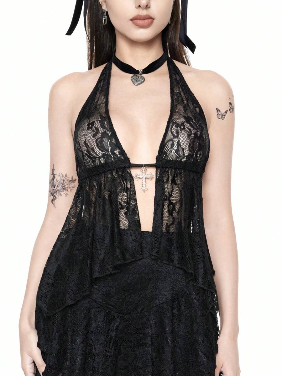 Gothic Cross Lace Sheer Neck Backless Sexy Women's Tank Top