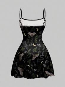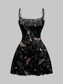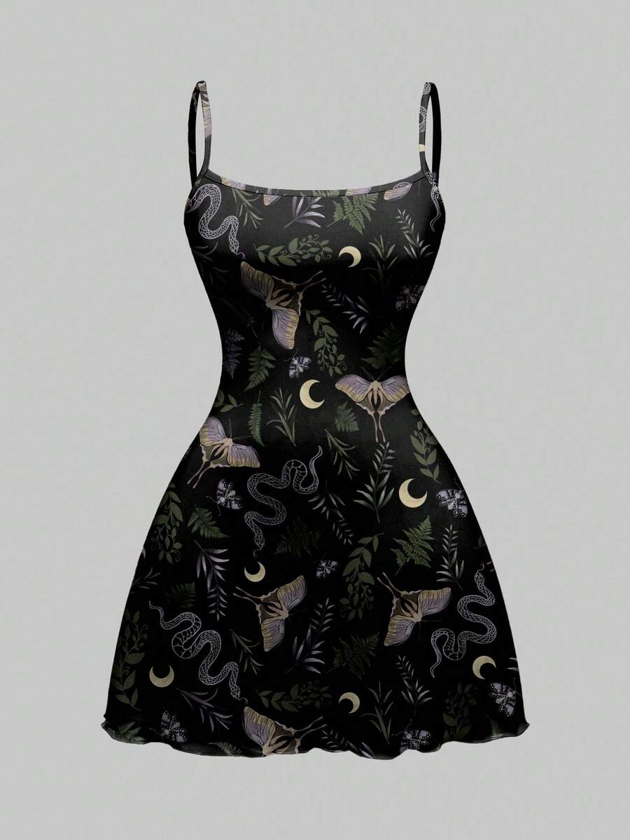Gothic Dark Halloween Snake, Sun, Moon, Star, Moth, Plant Print Mini Dress For Women