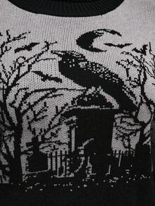 Gothic Dark High Neck Warm Crow Grave Moon Bat Branch Jacquard Black Lantern Sleeve Plus Size Pullover Sweater