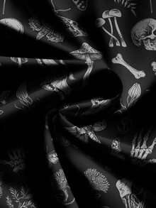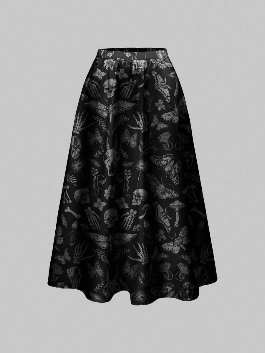 Goth Gothic Dark Horror Halloween Crow Skull Moth Plant Print Black Full-Print Women Skirt