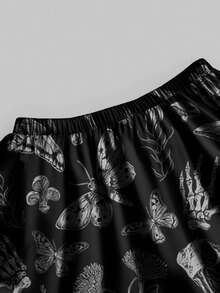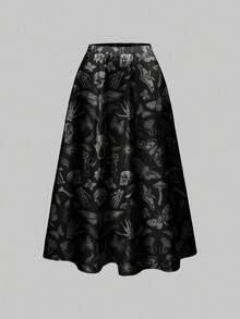 Gothic Dark Horror Halloween Crow Skull Moth Plant Print Black Full-Print Women Skirt