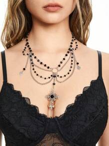 Gothic Dark-Style Faux Pearl Multi-Layer Chain Cross Pendant Necklace For Women