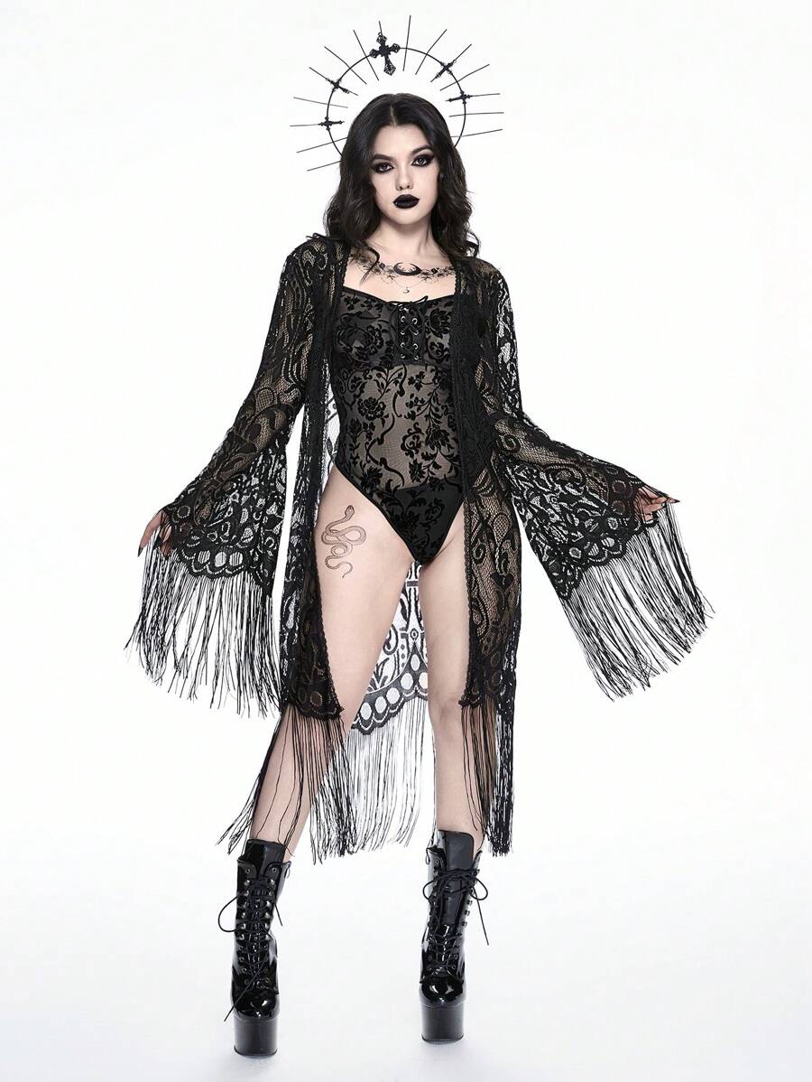 Gothic Floral Flocked Jumpsuit Wrap Top & Sexy Lingerie Set