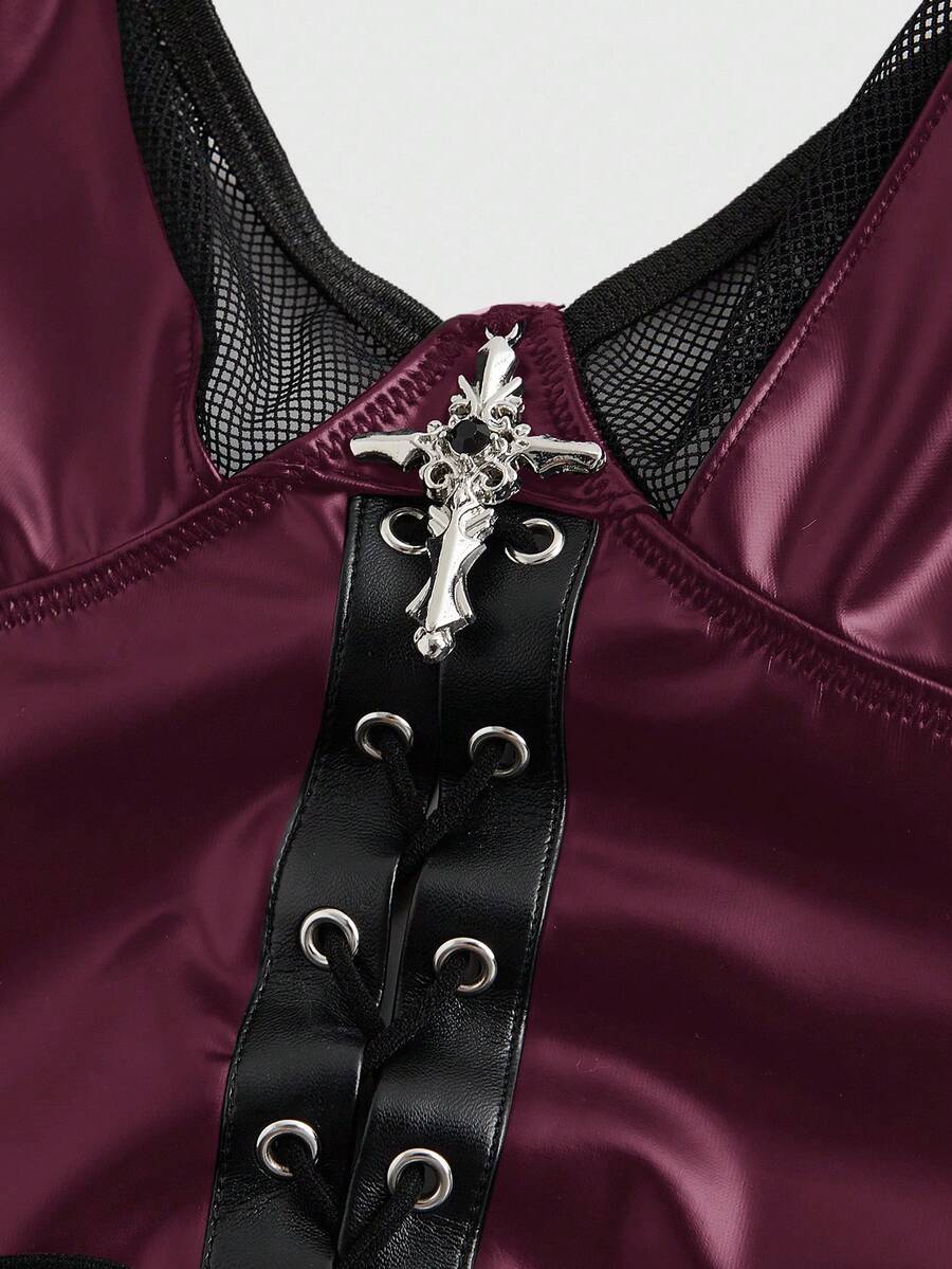 Gothic Mesh Patchwork Lace-Up Plus Size Women Leather Suspender