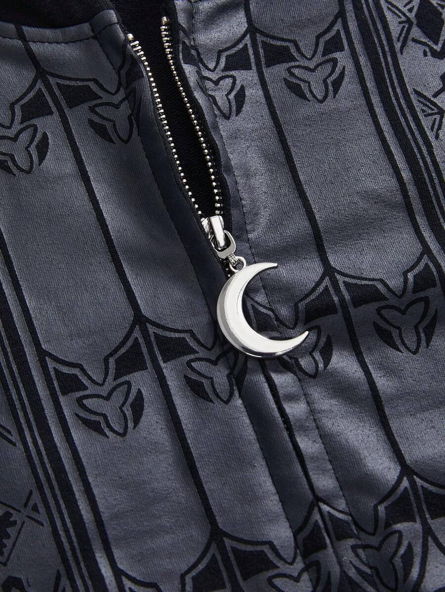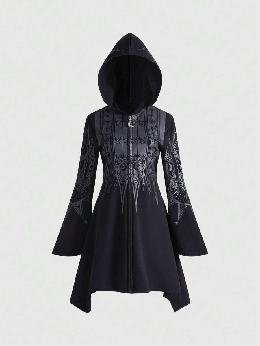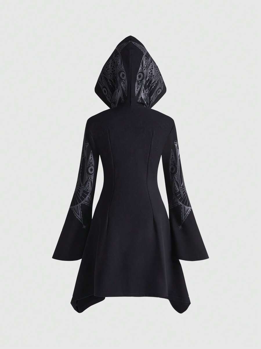 Gothic Palace Style Halloween Castle Print Hooded Flare Sleeve Asymmetrical Hem Fitted Long Sweatshirt For Women