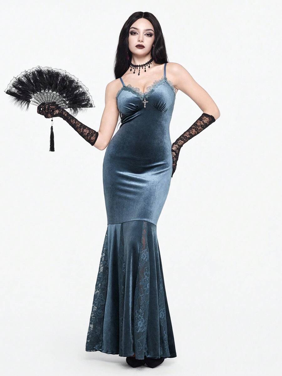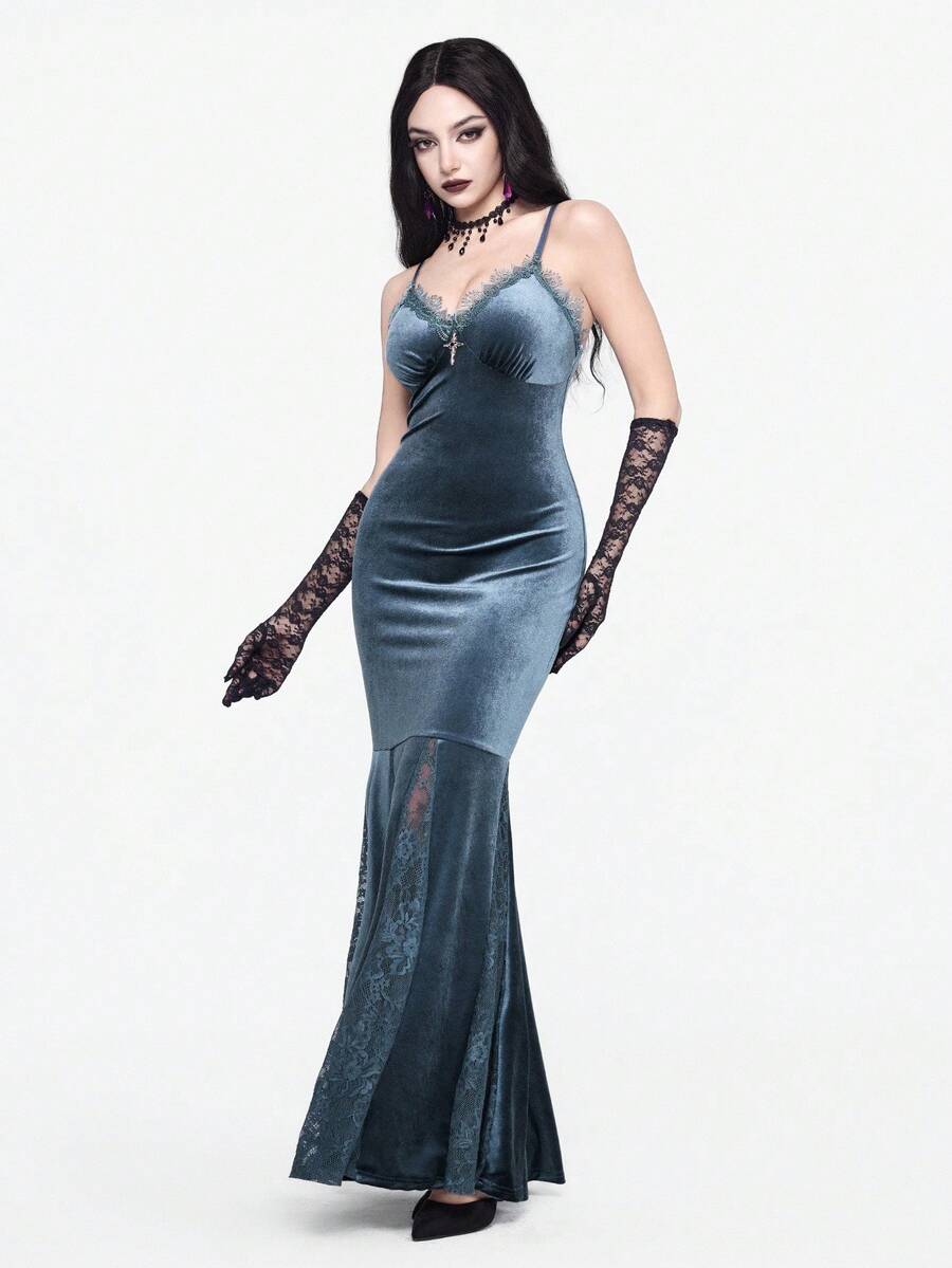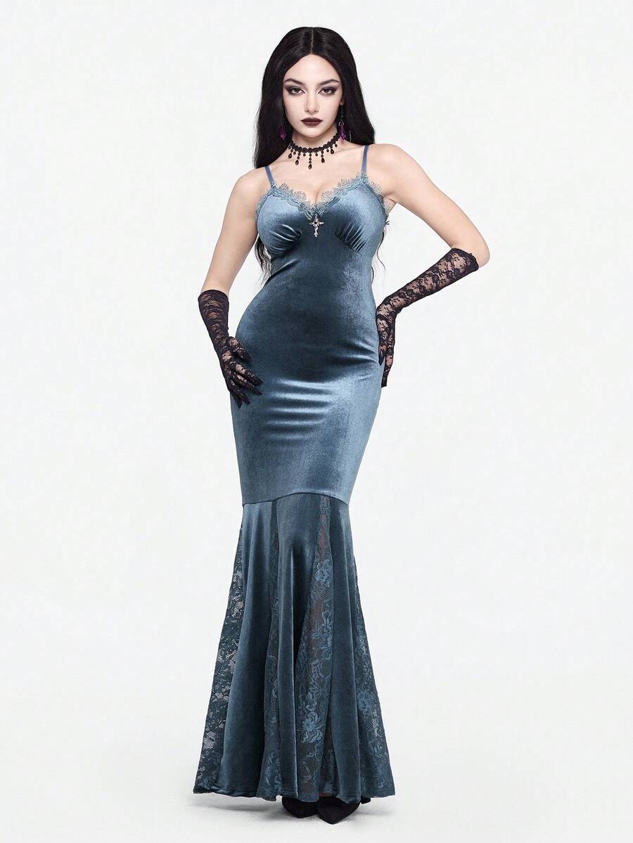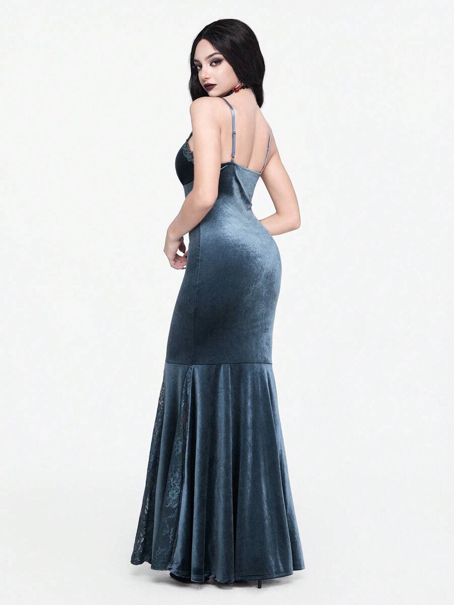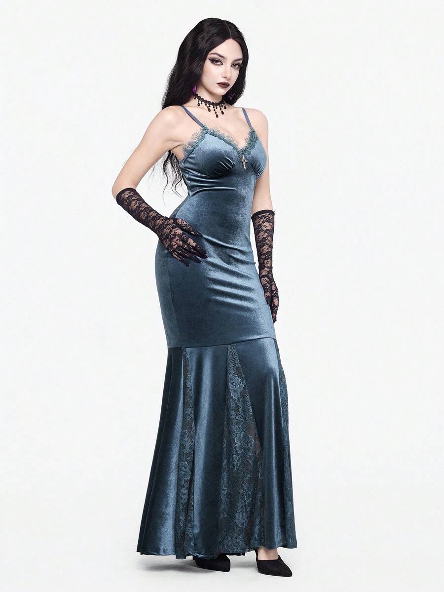 Gothic Palace Style Velvet & Lace Collar Cross Pendant Deep V Waist Fitted Maxi Mermaid Dress For Women, Halloween