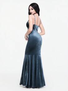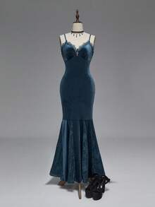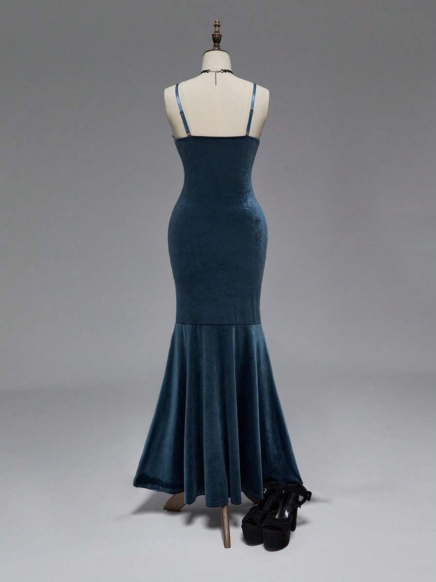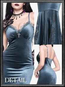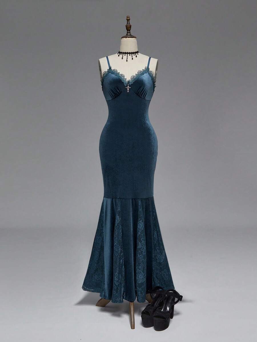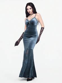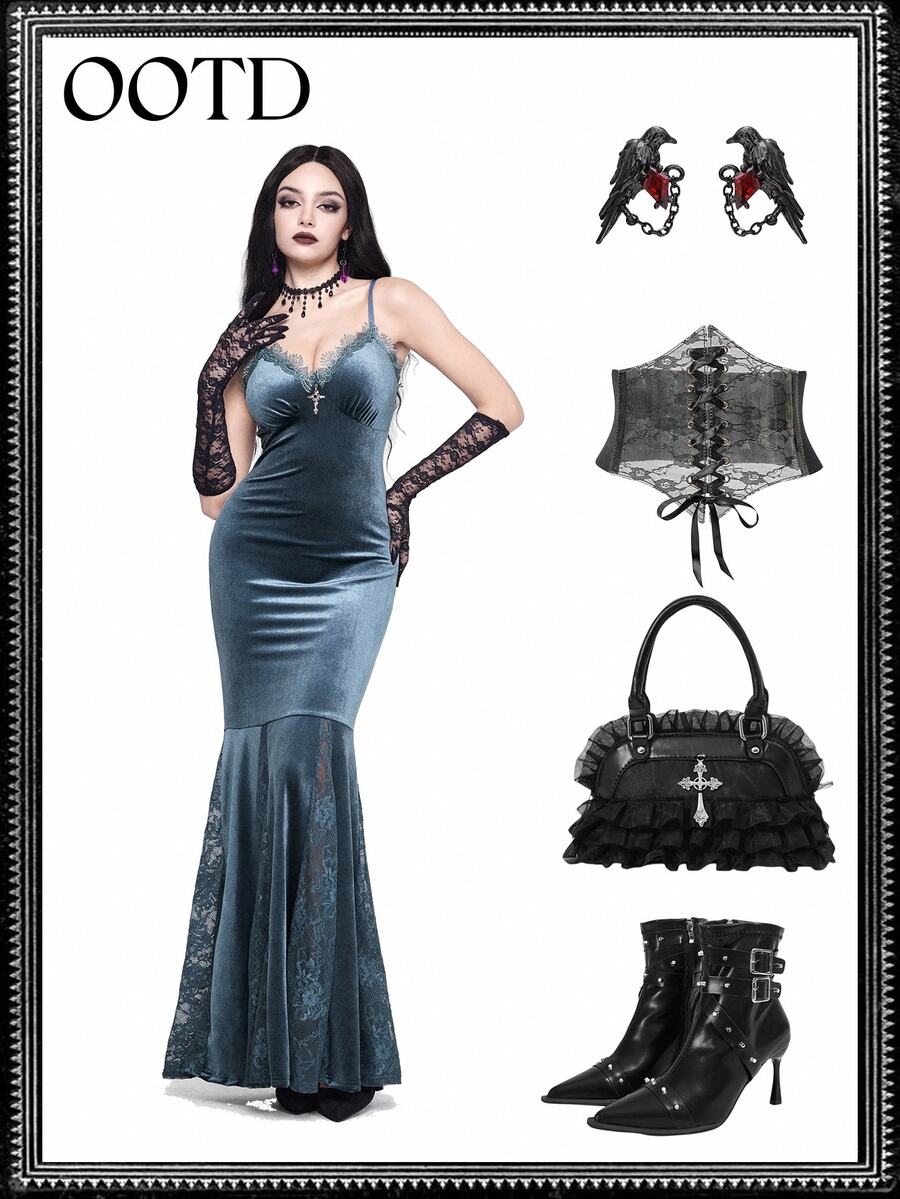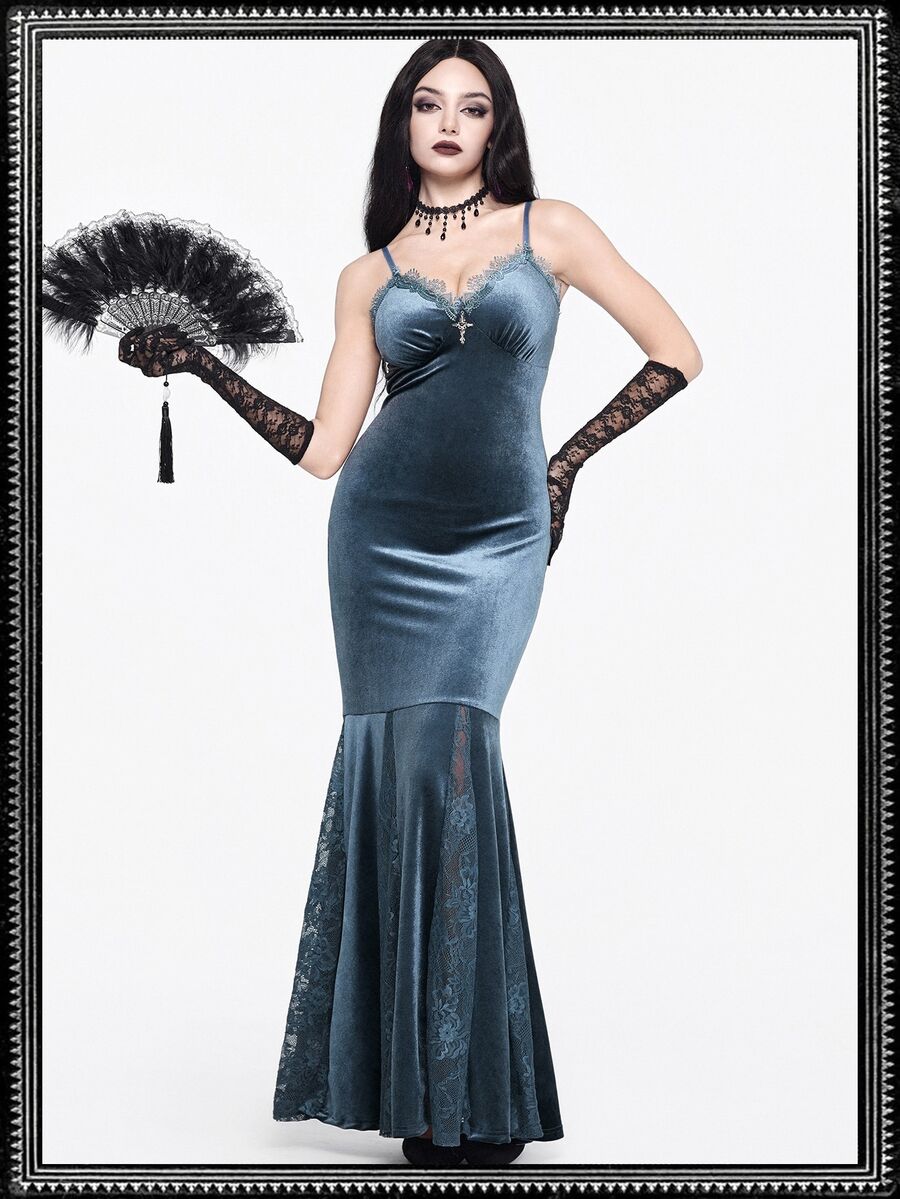 Gothic Palace Style Velvet & Lace Collar Cross Pendant Deep V Waist Fitted Maxi Mermaid Dress For Women, Halloween