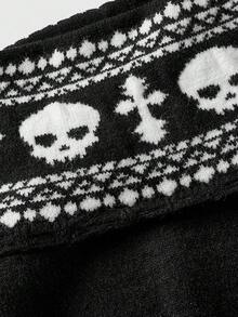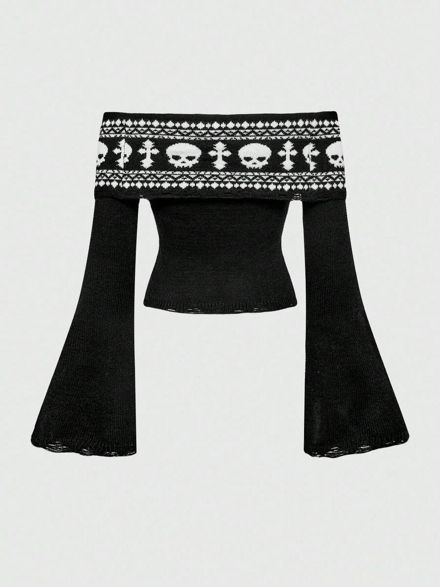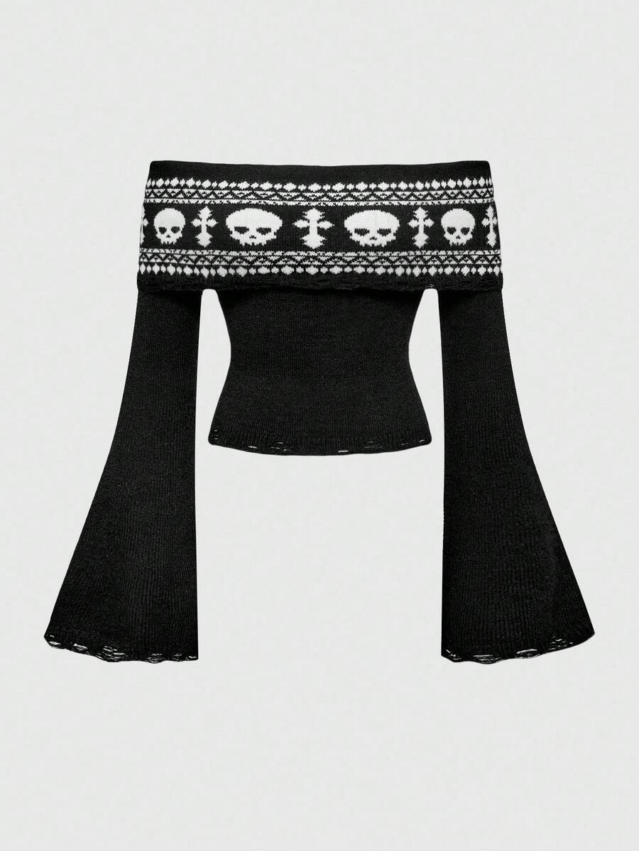 Goth Gothic Retro Collar Off-Shoulder Skull & Bat Jacquard Flare Sleeve Women Sweater