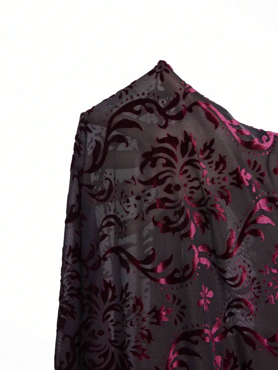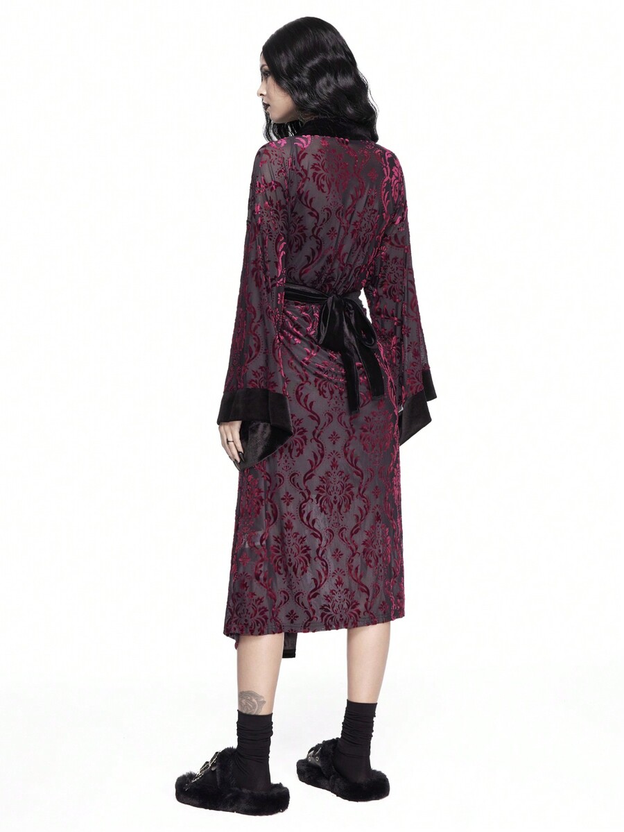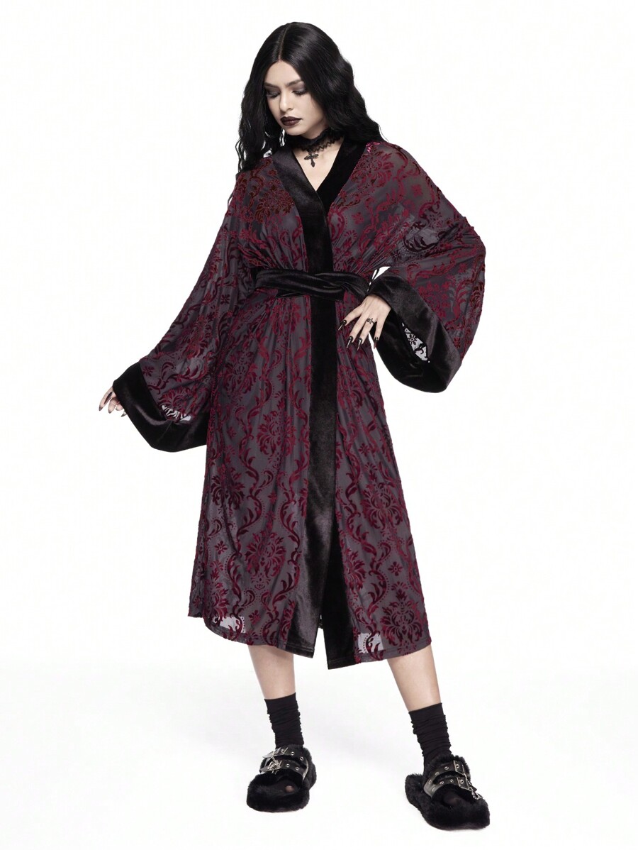 Gothic Style Christmas Flocked Floral Contrast Color Sexy Sheer Long Cardigan & Belted Dress Set
