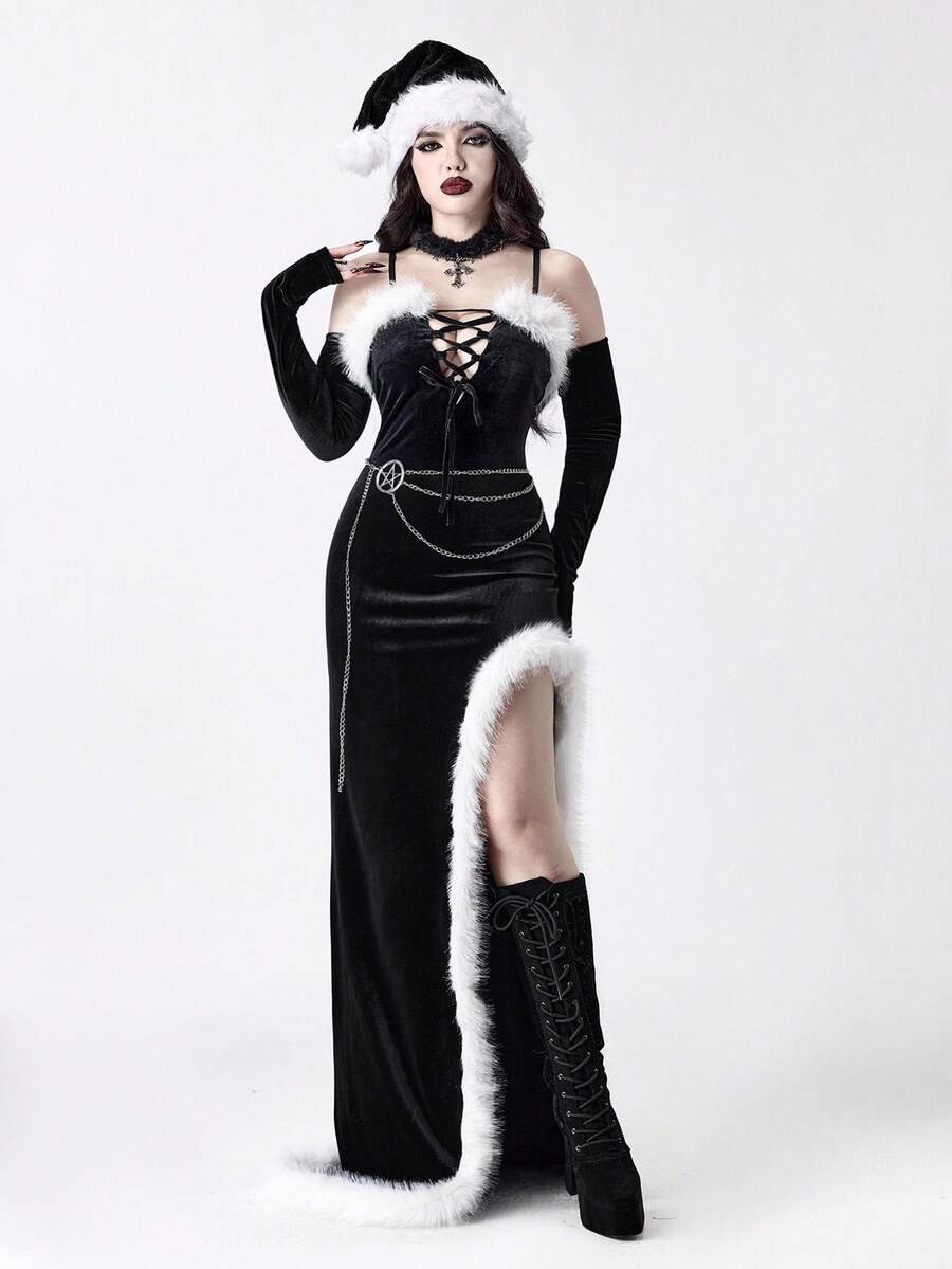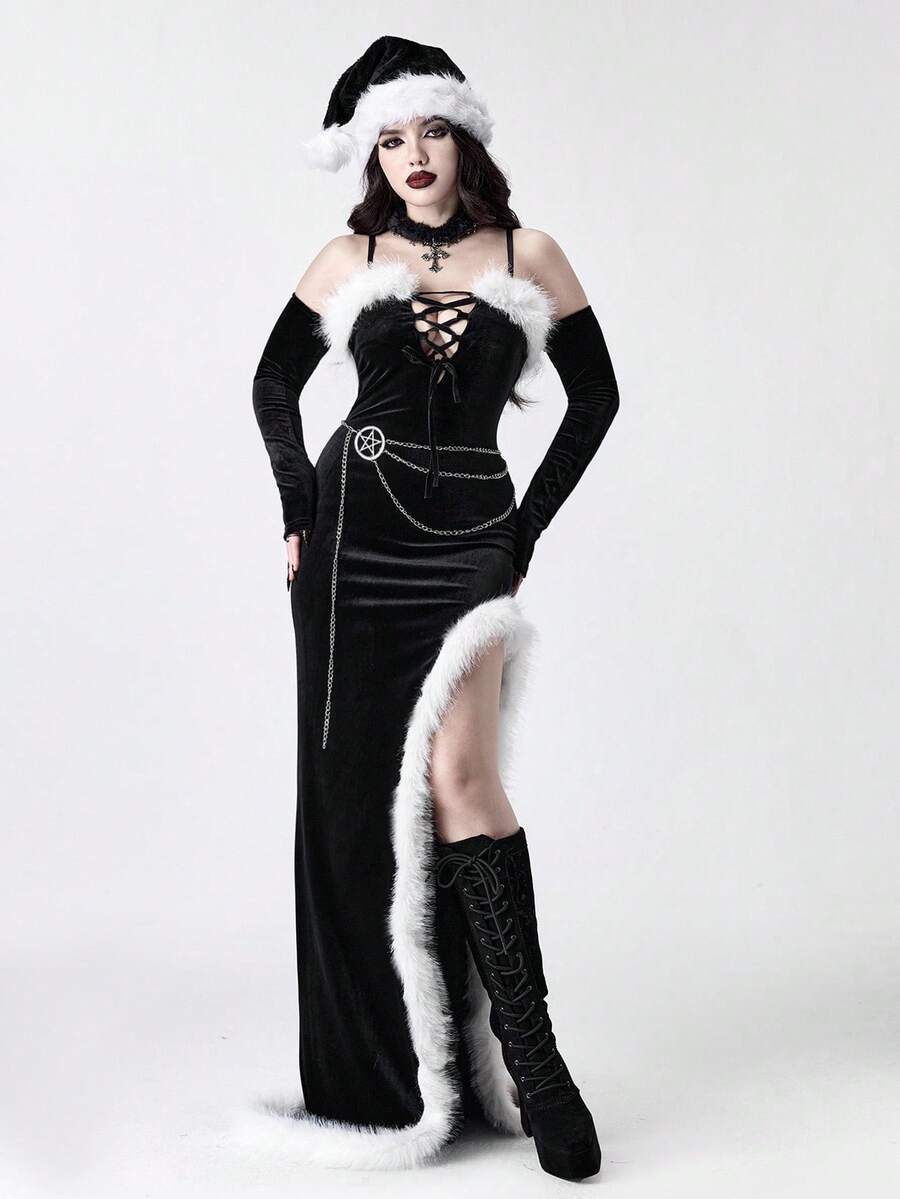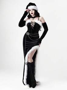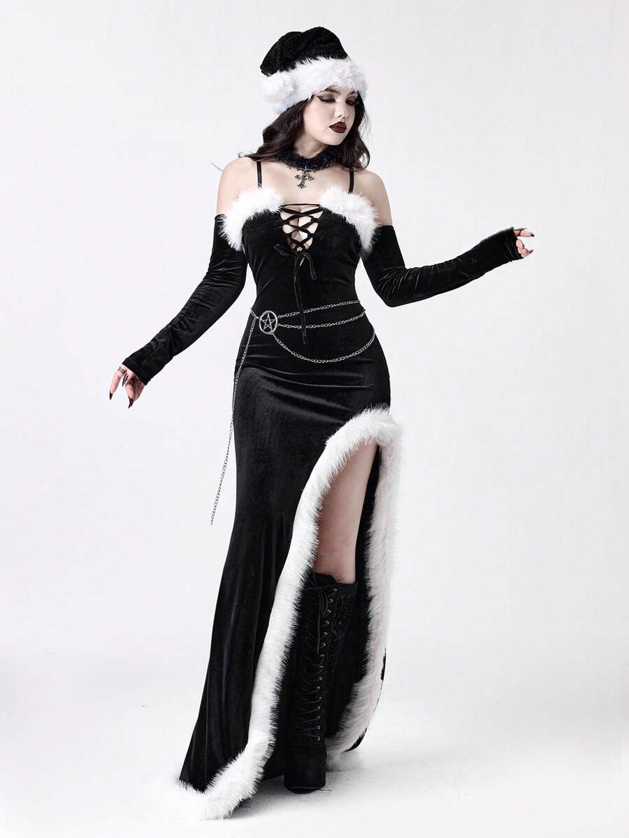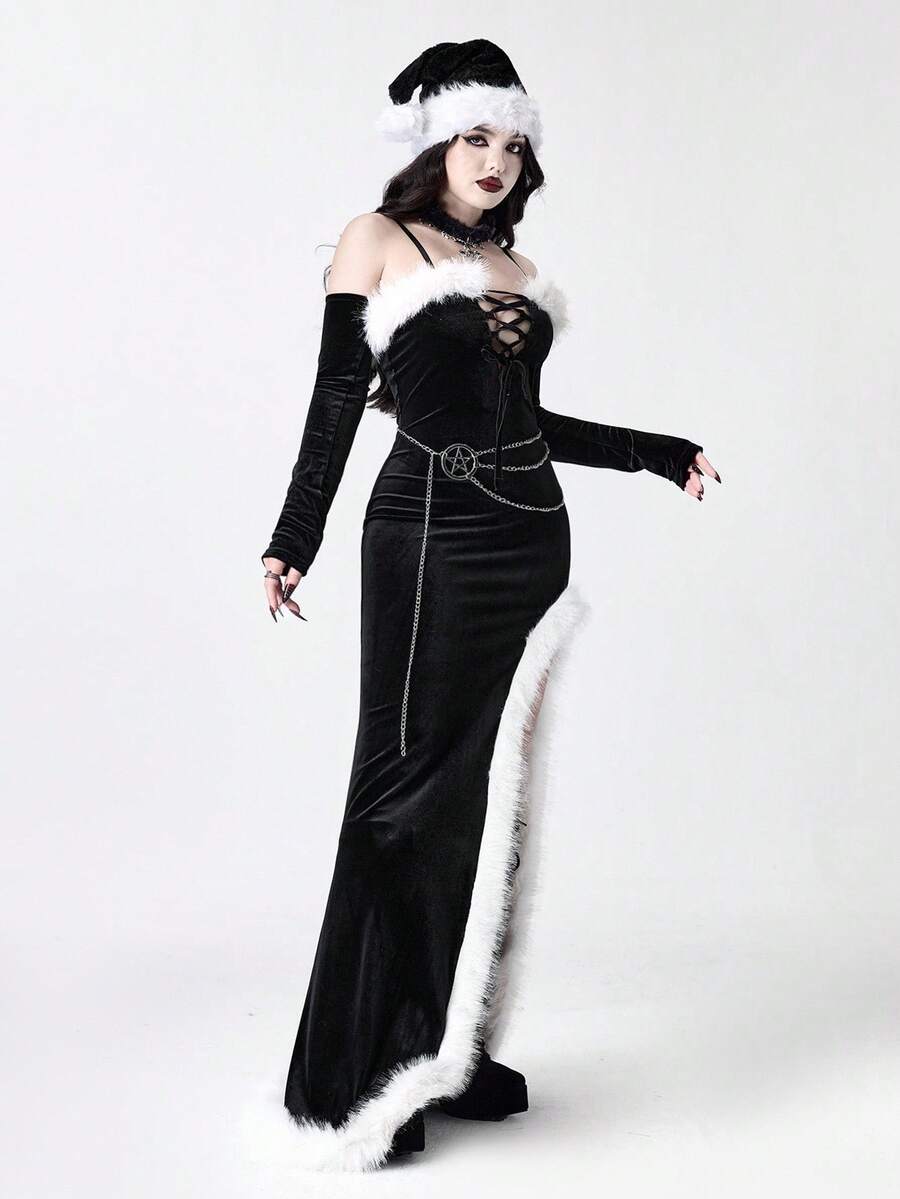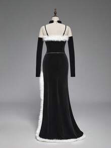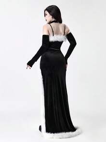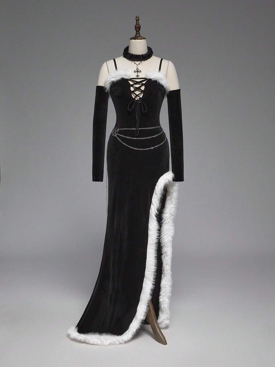 Gothic Style Velvet Patchwork Faux Fur High Slit Bodycon Dress