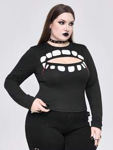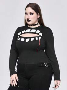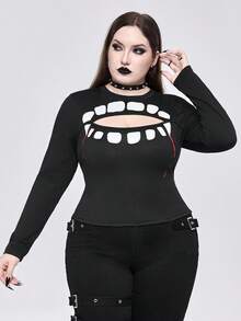 Goth Gothic Teeth Print Hollow Out Plus Size Women Tight T-Shirt
