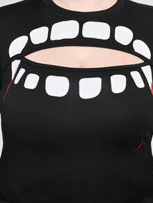 Gothic Teeth Print Hollow Out Plus Size Women Tight T-Shirt