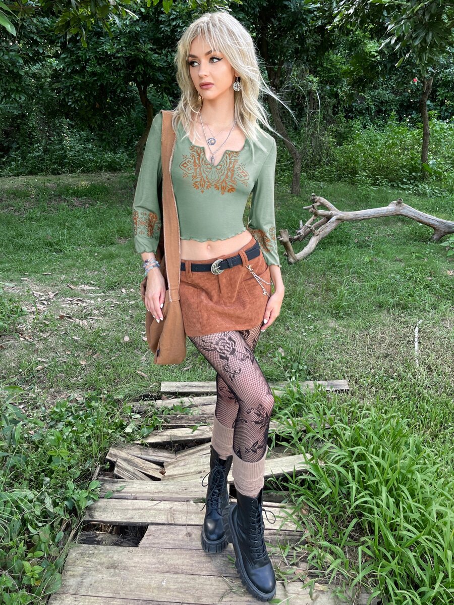 Grunge Floral Print Notched Neck Lettuce Trim Crop Tee