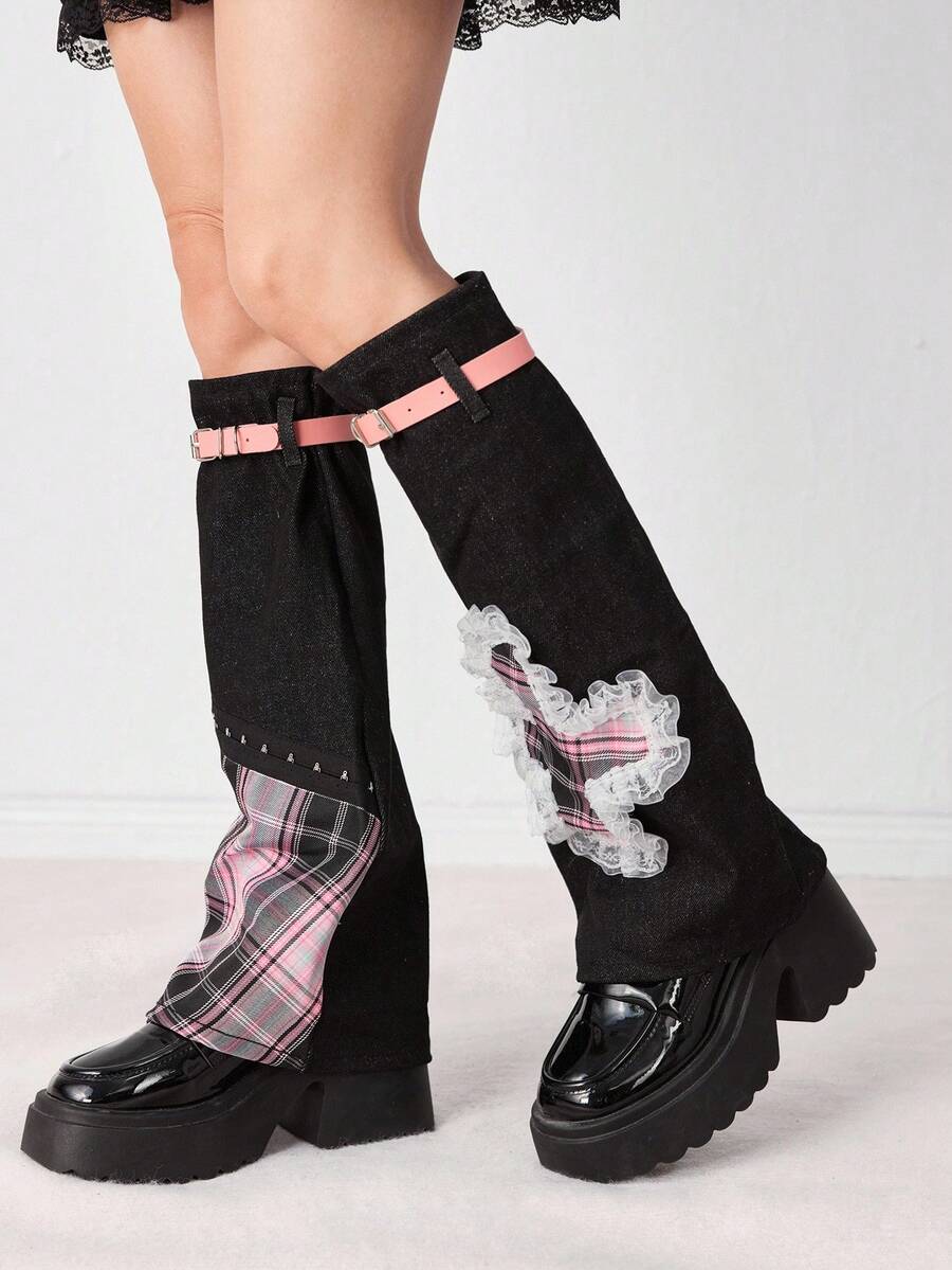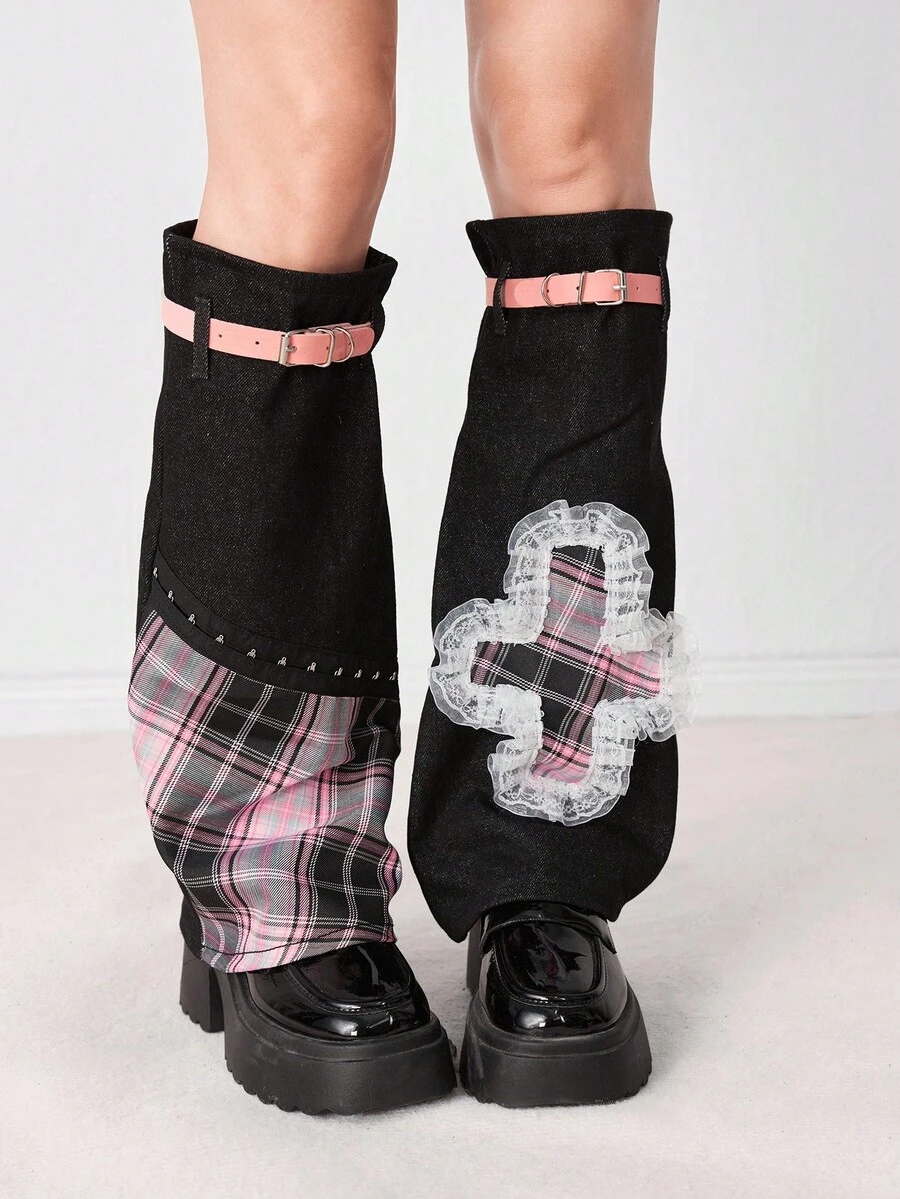 Grunge Punk 1 Pair Punk Style Colorful Plaid Cross Graphic Leg Warmers, Y2K Lace Trim PU Leather Strap Black Solid Flare Leg Sleeves, & Slimming, Suitable For Daily, Holiday & Party Wear