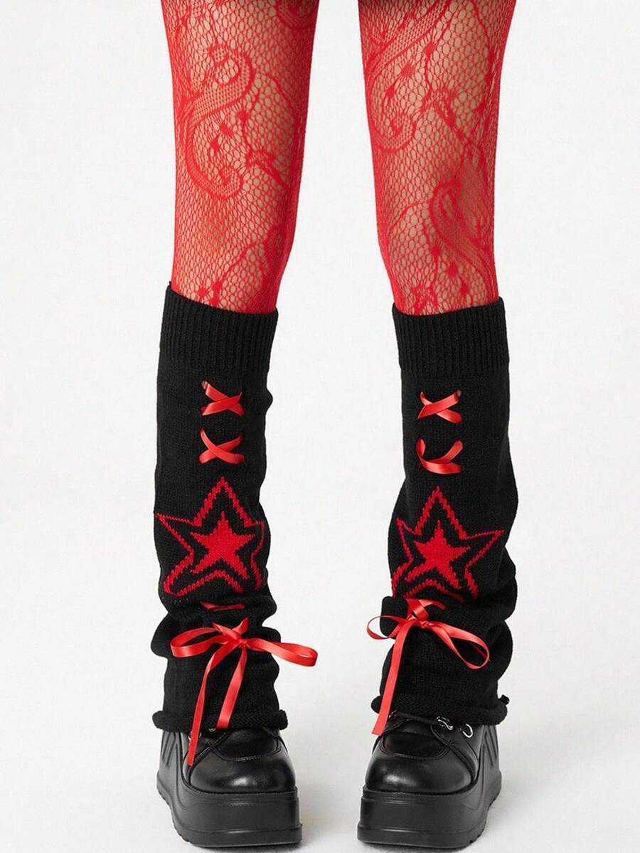 Grunge Punk 1 Pair Punk Style Tornado Pattern Red Fishnet Socks + 1 Pair Y2K Star Pattern Leg Garter, Suitable For Daily, Dance Party, Tight Fit Socks Combination
