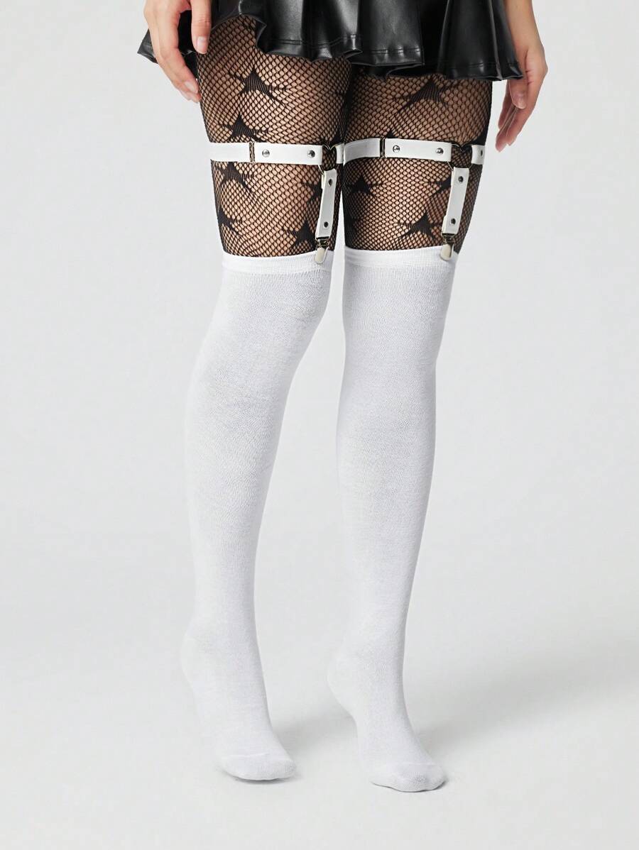 Grunge Punk 1 Pair Solid Color Star Element Tights + 2 Pcs White Garter Belts + 1 Pc White Over-The-Knee Socks, Y2K Style Combination Outfit, Suitable For Daily Wear And Parties