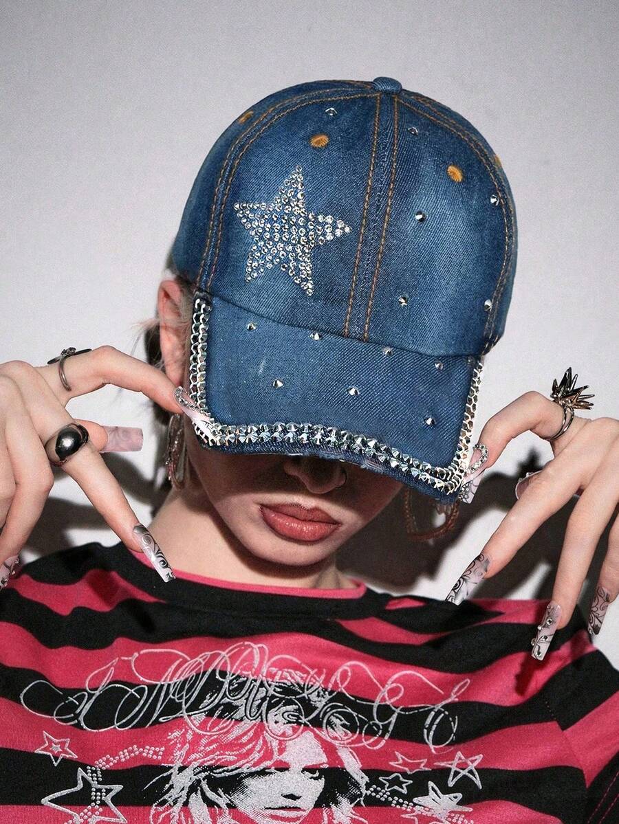 Grunge Punk 1 Rhinestone Rivet Cap, Spring Casual Hot Diamond Side Five-Pointed Star Baseball Cap, Suitable For Daily, Party, Music Festival Wear