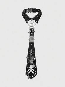 Grunge Punk 1pc Black Y2K Punk Style Rivet Zipper Metal Skull & Letter Print Unisex Necktie, Goth Dark Accessories, Unique Personalized Decor