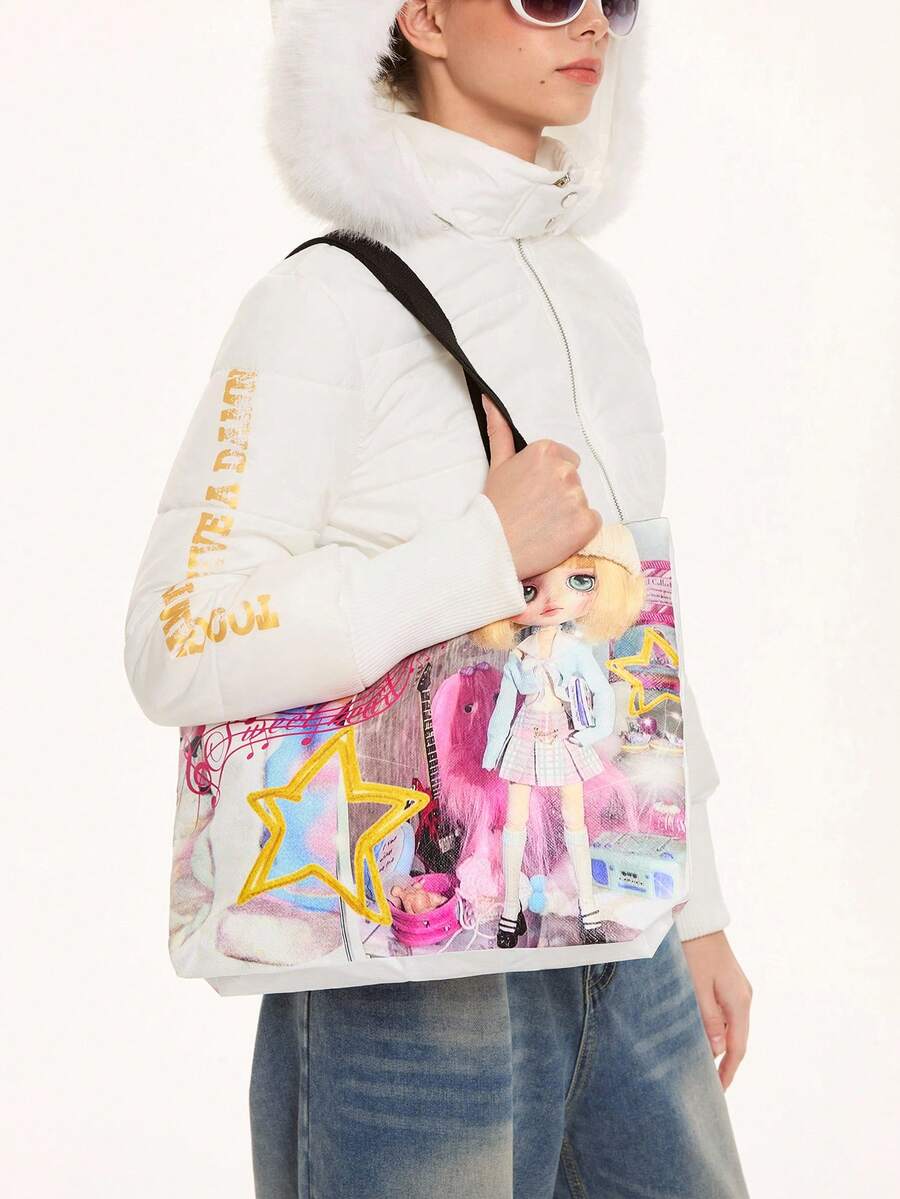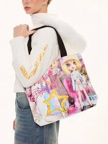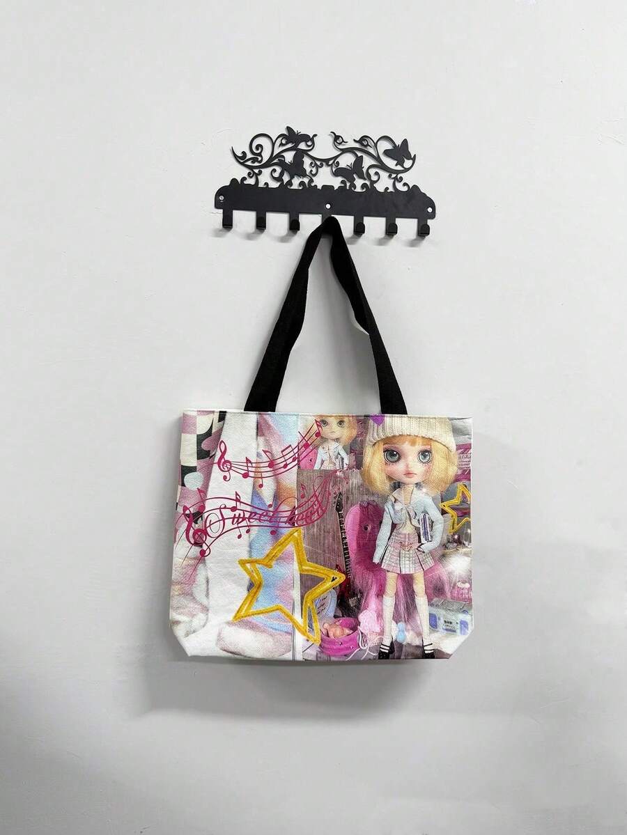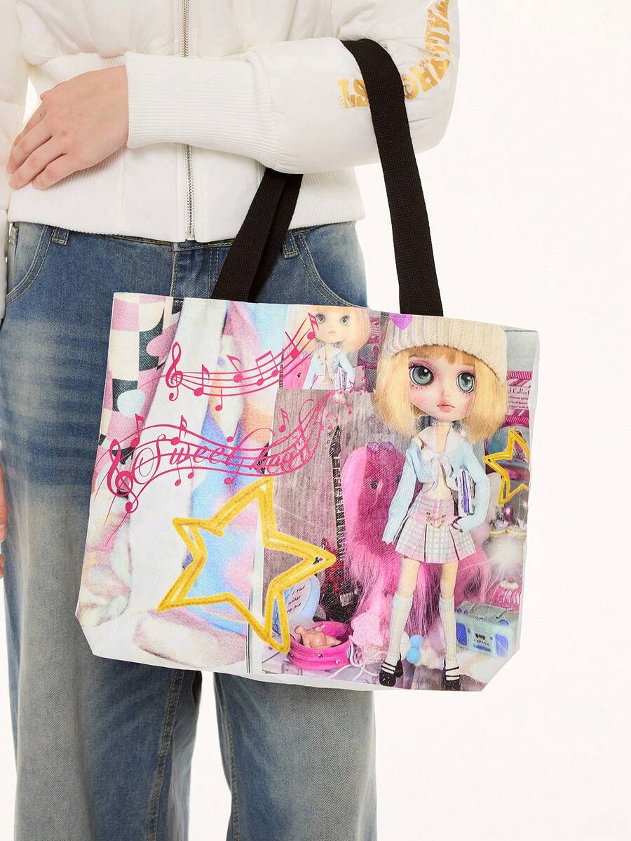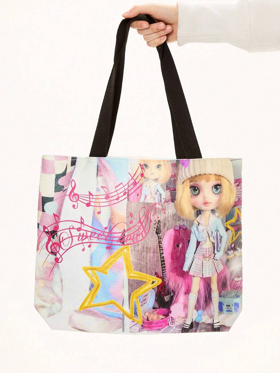 Grunge Punk 1pc Cute Doll Printed Large Capacity Hand-Held Shoulder Bag With Musical Notes And Star Elements Embellishing Daily Travel, Shopping, Commuting, Practical Bag
