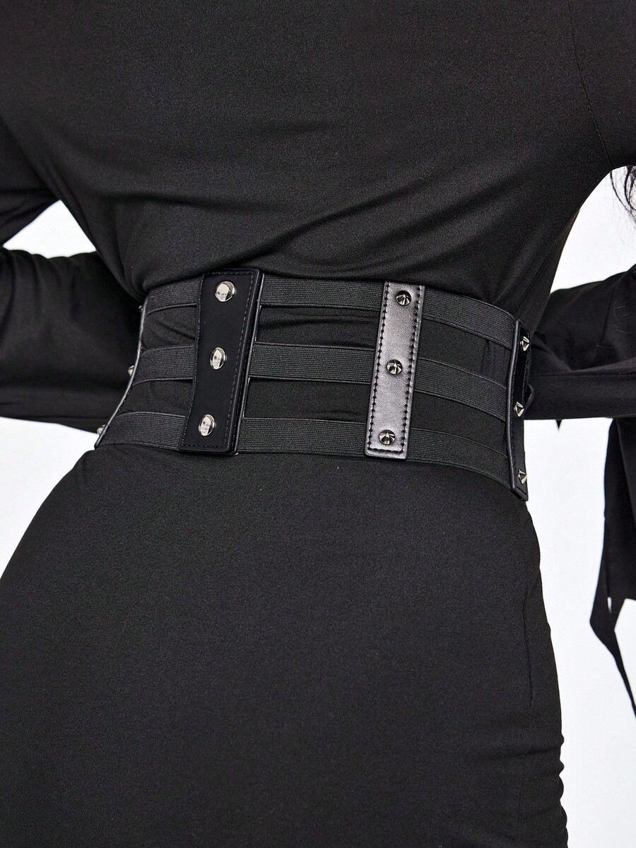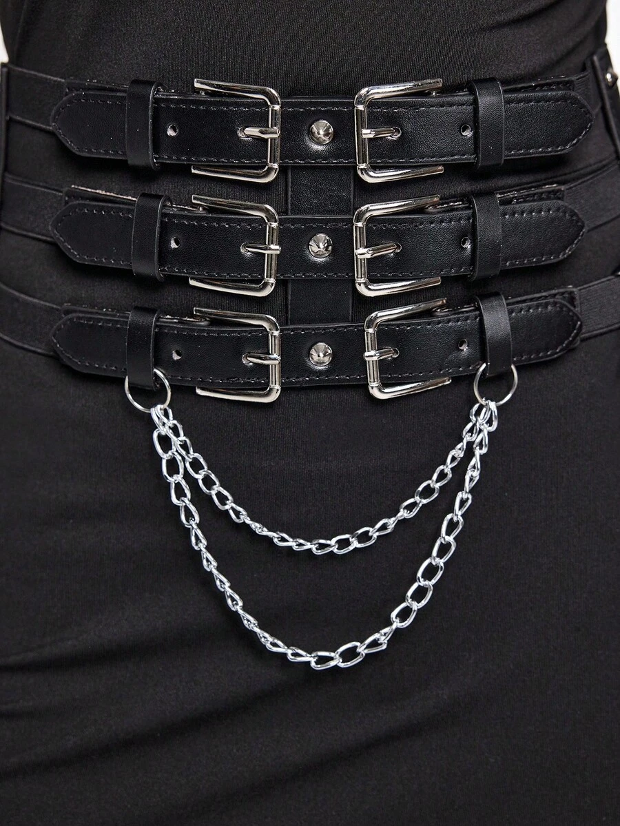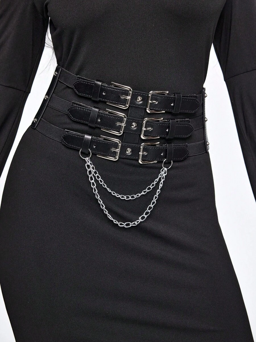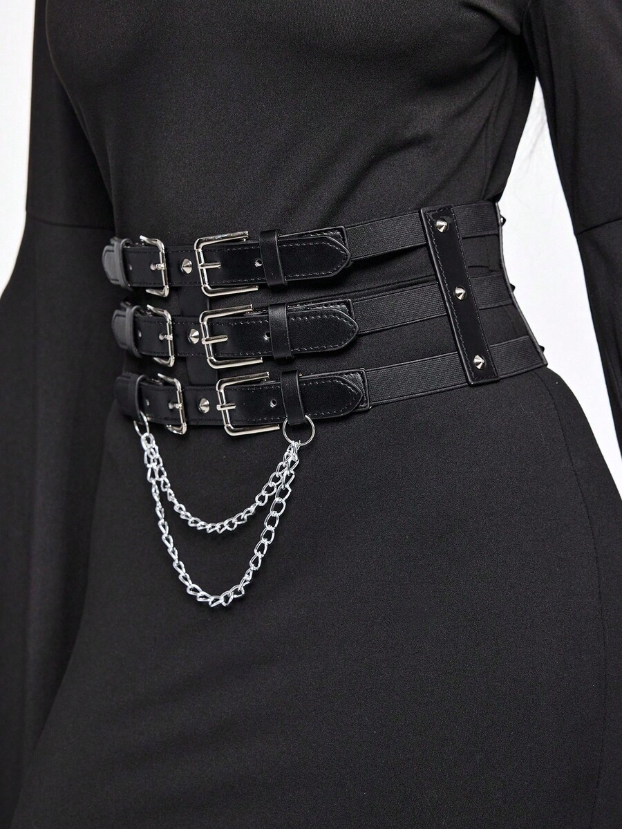 Grunge Punk 1pc Punk Style 3-Row Buckle Elastic Waist Belt, Y2K Chain Pendant Personalized Elastic Waistband Belt, Versatile Buckle Waist Belt For Pants