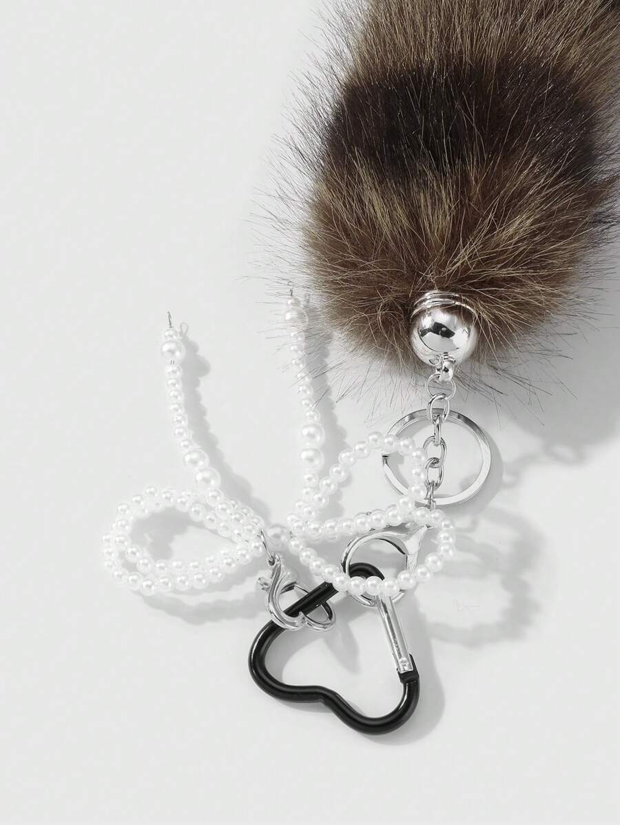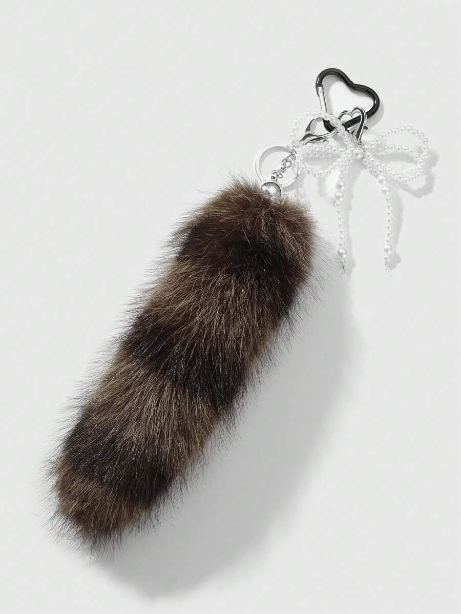Grunge Punk 1pc Retro Fashionable Korean Style Handcrafted Beaded White Faux Pearl Dual-Layer Bow, Brown Striped Faux Fur Animal Tail Keychain & Keyring, Bag Charm Decor, Suitable For Women, Daily Wear, Holiday Gift