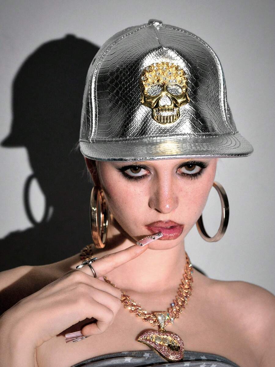 Grunge Punk 1pc Rhinestone Embellished Baseball Cap, Y2K Style Adjustable Size Skull Silver Snapback Hat, Fashion Casual Design, Daily Stylish Accessory