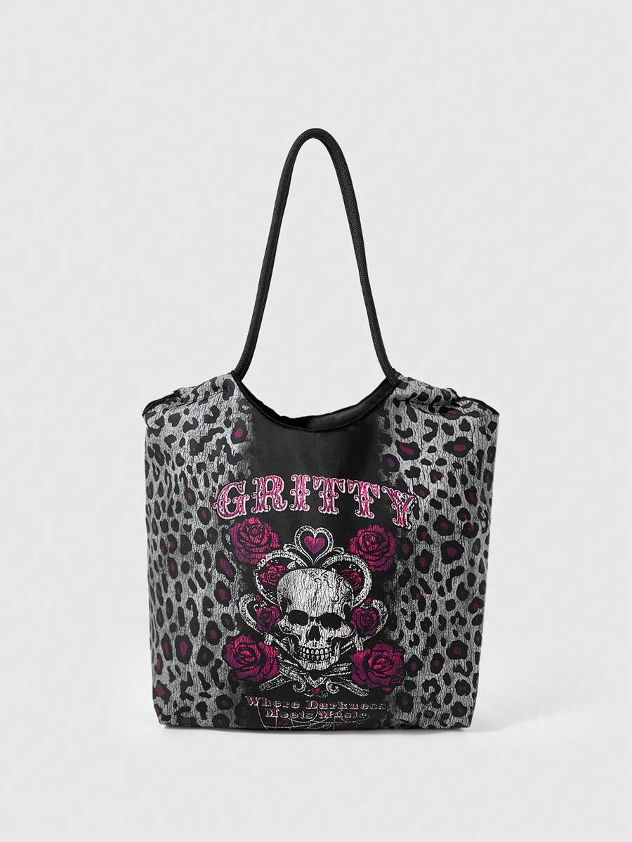 Grunge Punk 1pc Skull Head And Leopard Print Ladies Tote Bag