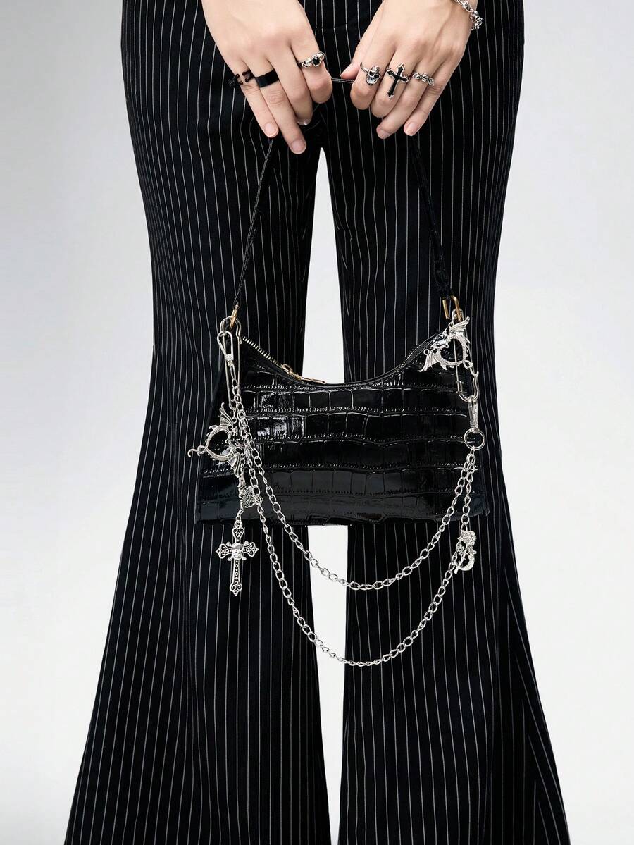 Grunge Punk 1pc Subculture Dark Punk Crossbody Bag With Skull, Underarm Bag, Y2K Streetwear Crocodile Texture Chain Shoulder Bag