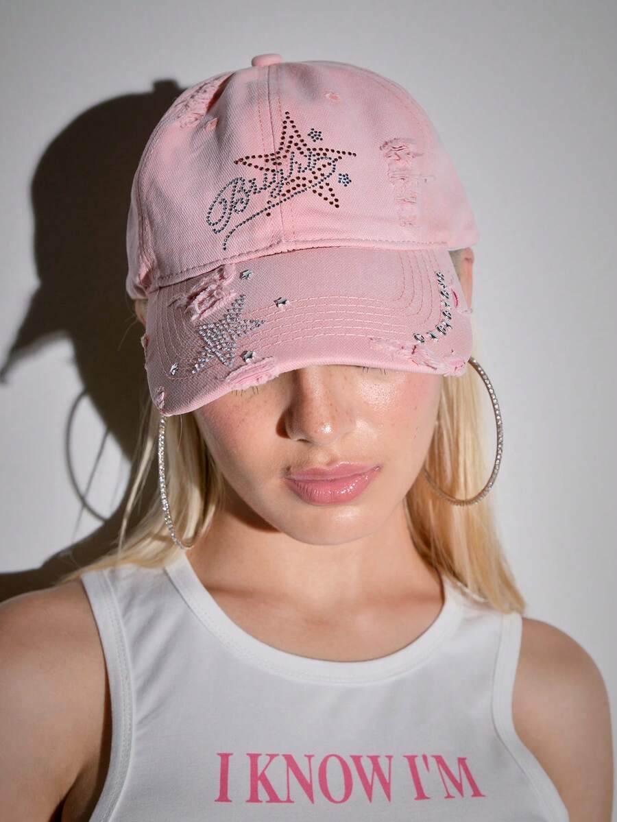 Grunge Punk 1pc Women's Star Rhinestone Embellished Baseball Cap, Suitable For Everyday Wear