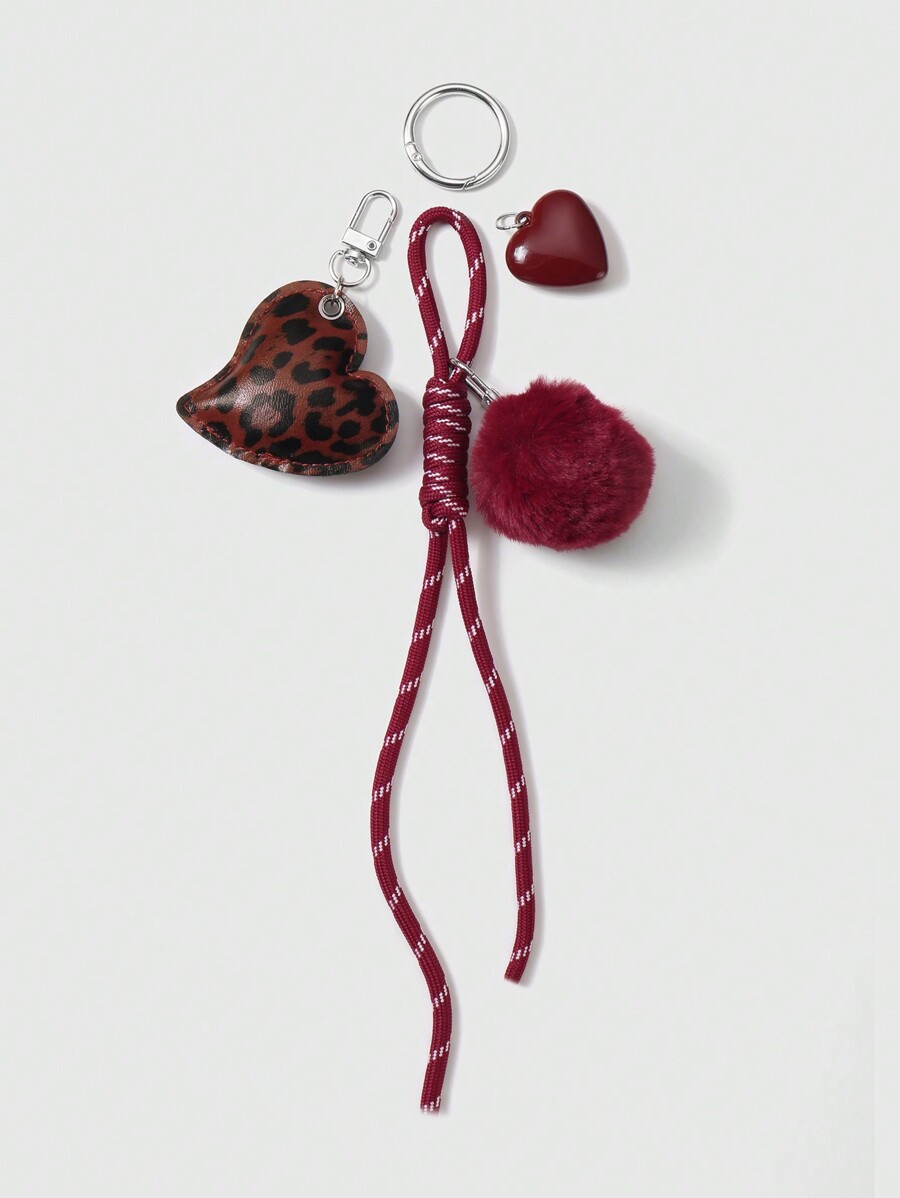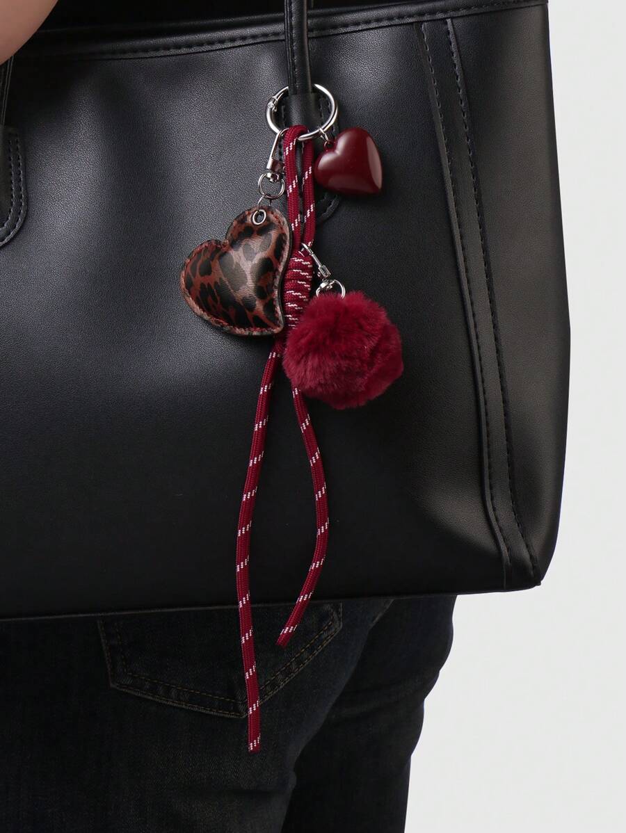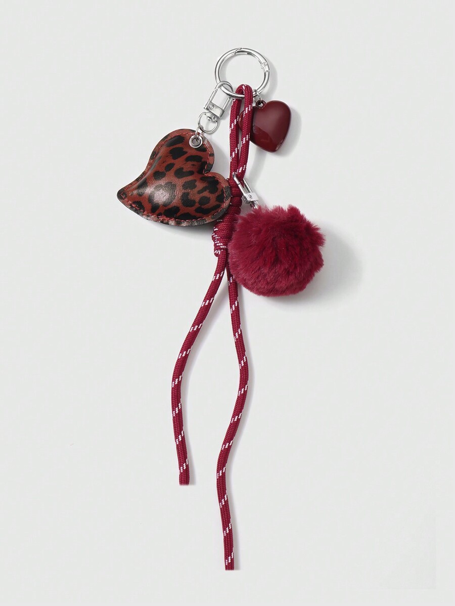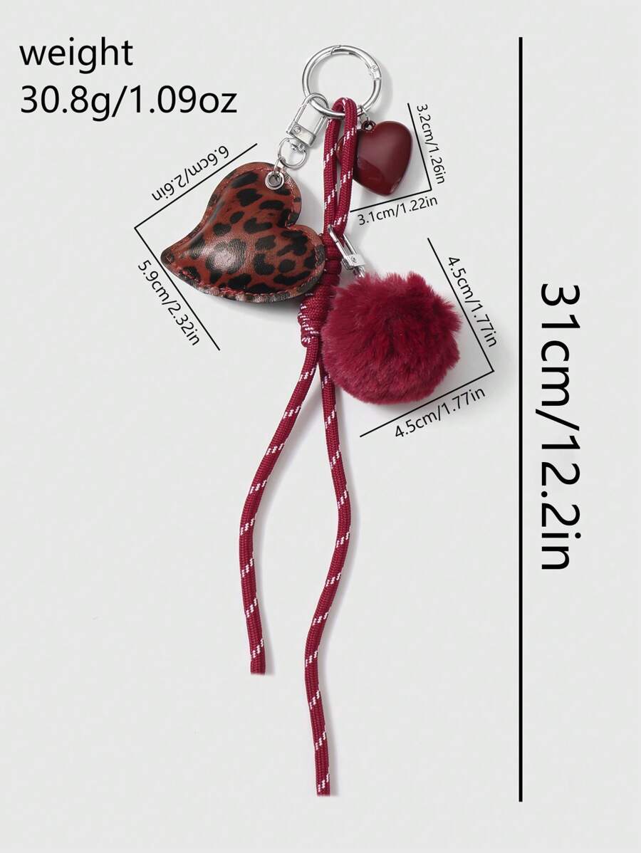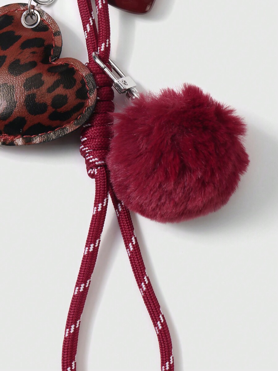 Grunge Punk 1pc Y2K Chic Highly Attractive College Style Red Furball Faux Leather Leopard Print Acrylic 3D Heart Adjustable Drawstring DIY Keychain & Bag Charm, Suitable For Women, Daily Accessory And Festival Gift