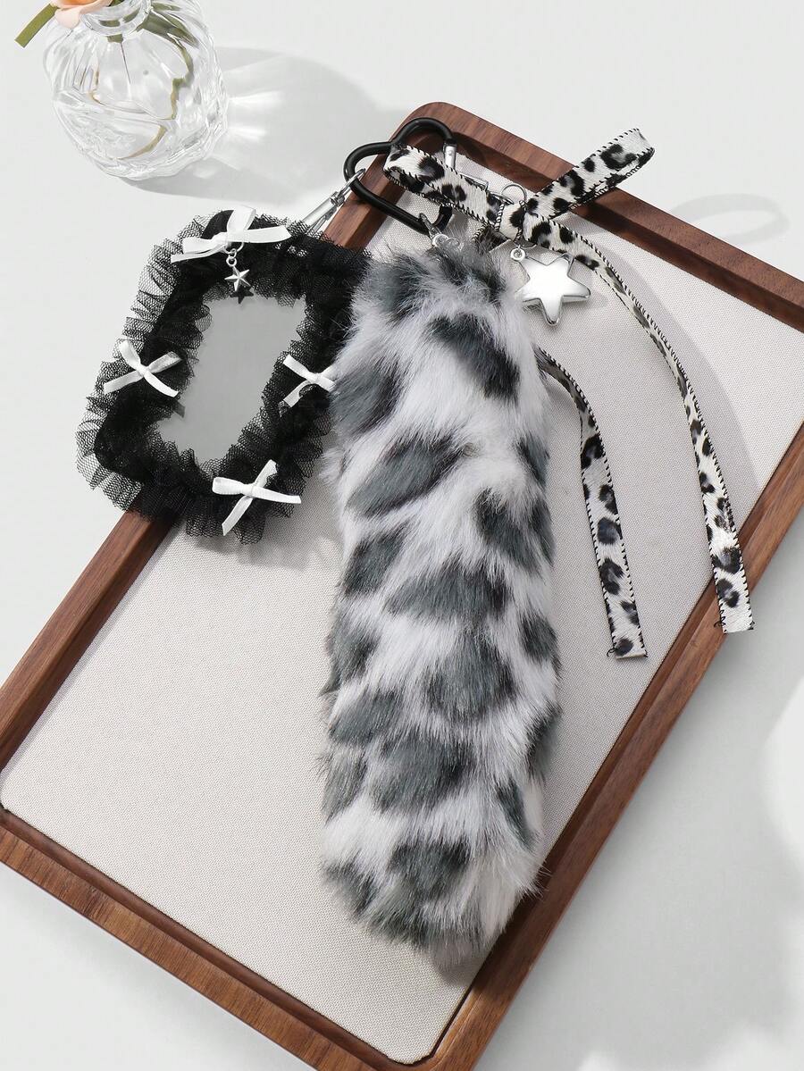 Grunge Punk 1pc Y2K Vintage Sweet Gothic Style Grey Plush Animal Leopard Print Fake Tail, Leather Heart Bowknot, CCB Star Net Yarn Lace Card Holder, DIY Keychain Bag Pendant, Suitable For Office Workers, Students And Daily Wear, Holiday Gift, Halloween