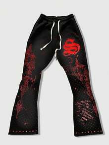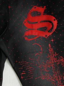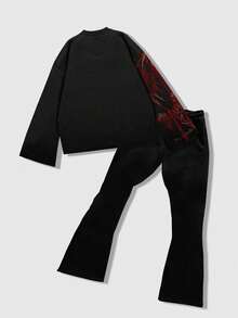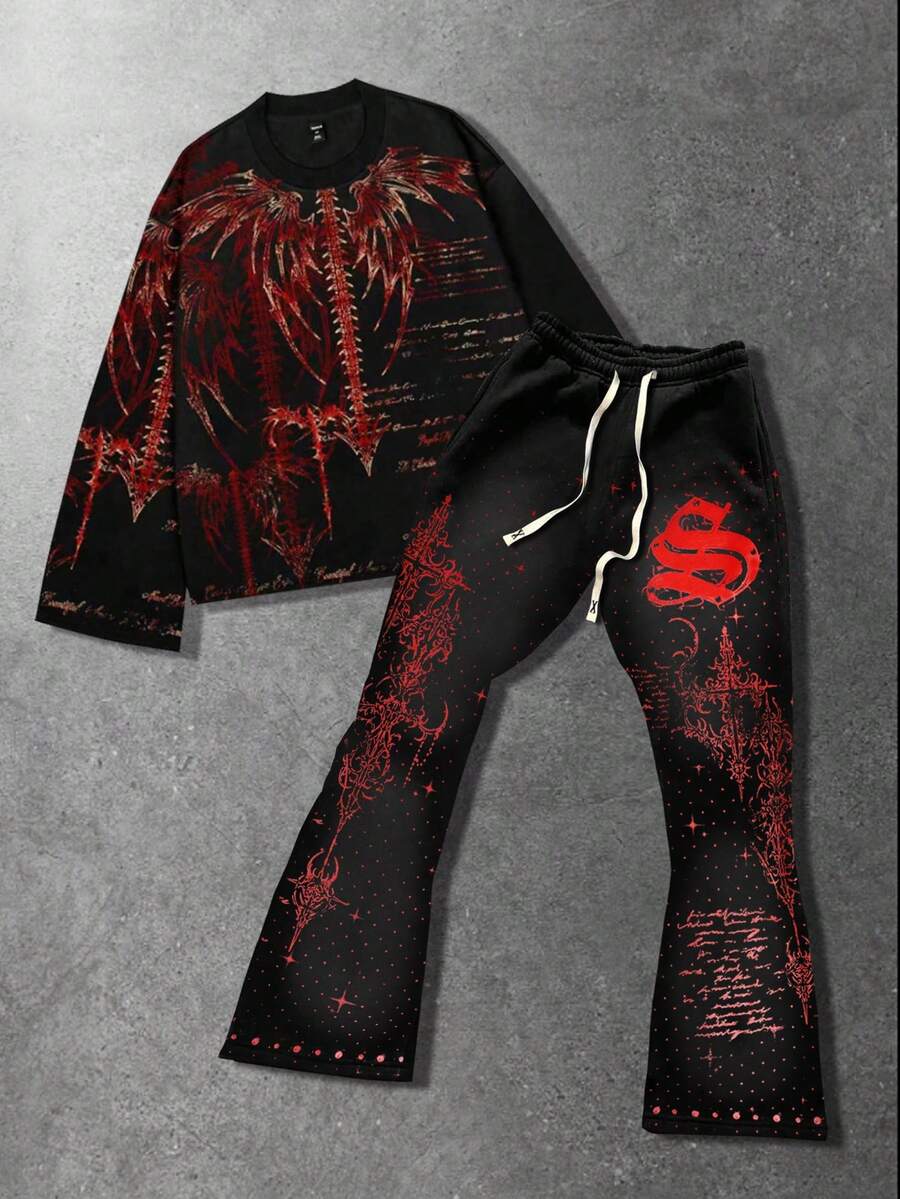 Grunge Punk 2pcs Men's Gothic All-Over Print Crew Neck Long Sleeve Top And Flared Leg Sweatpants Set, Autumn/Winter